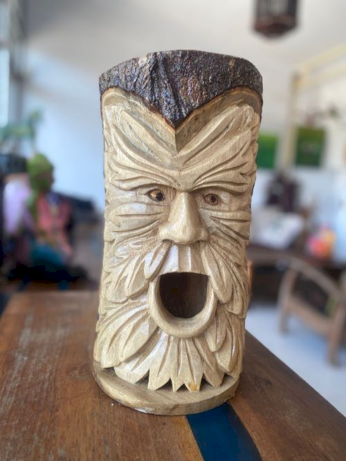 Apportez un objet artisanal et décoratif spectaculaire à votre rayon nature & jardin avec ce nichoir “Esprit de l’Arbre”, sculpté entièrement à la main dans du bois de Jempinis, un bois tropical indonésien solide et idéal pour les pièces détaillées. Son visage puissant et expressif, taillé directement dans le tronc, donne un caractère unique à chaque nichoir et attire immédiatement l’attention des clients.