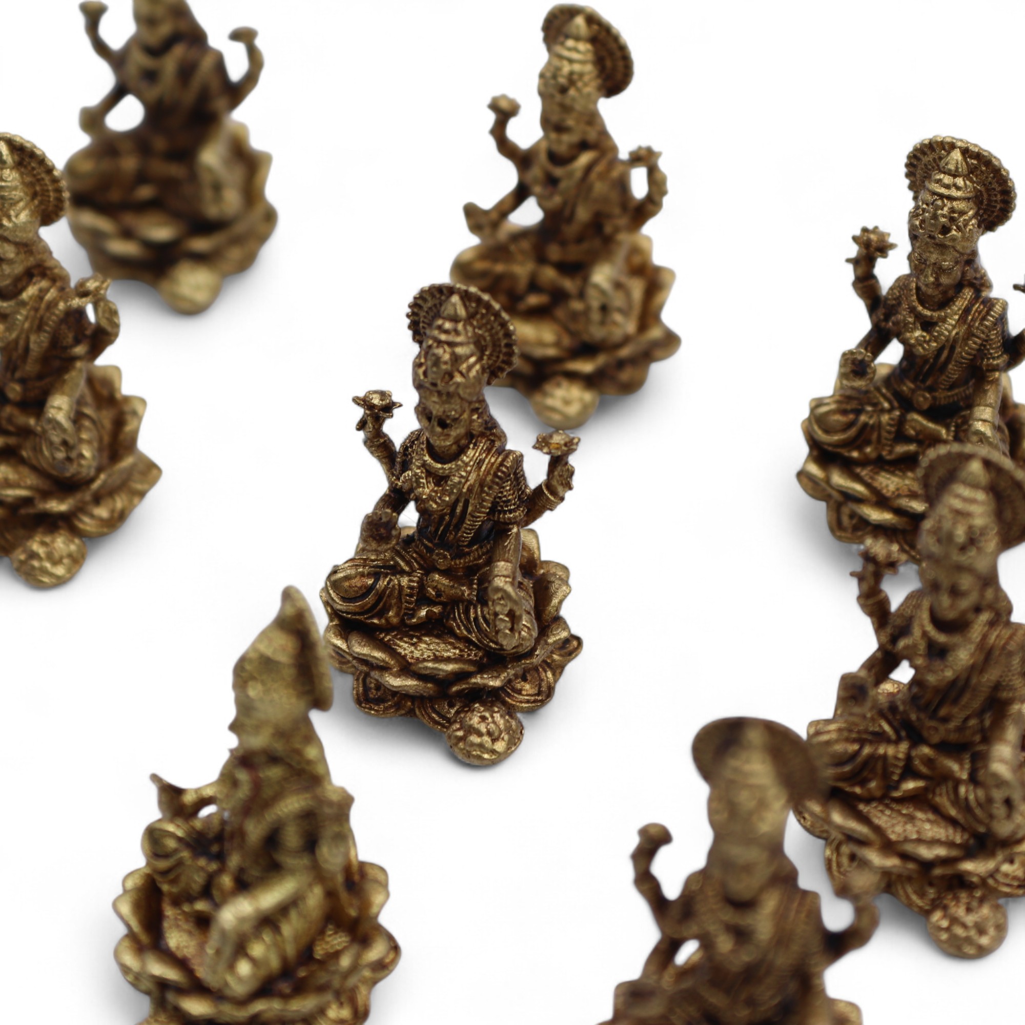 Mini-statuette de Lakshmi, déesse hindoue de la prospérité, réalisée en laiton massif avec finition antique. Format compact idéal pour autel, méditation ou cadeau spirituel (3 cm et poids : 11 g ).