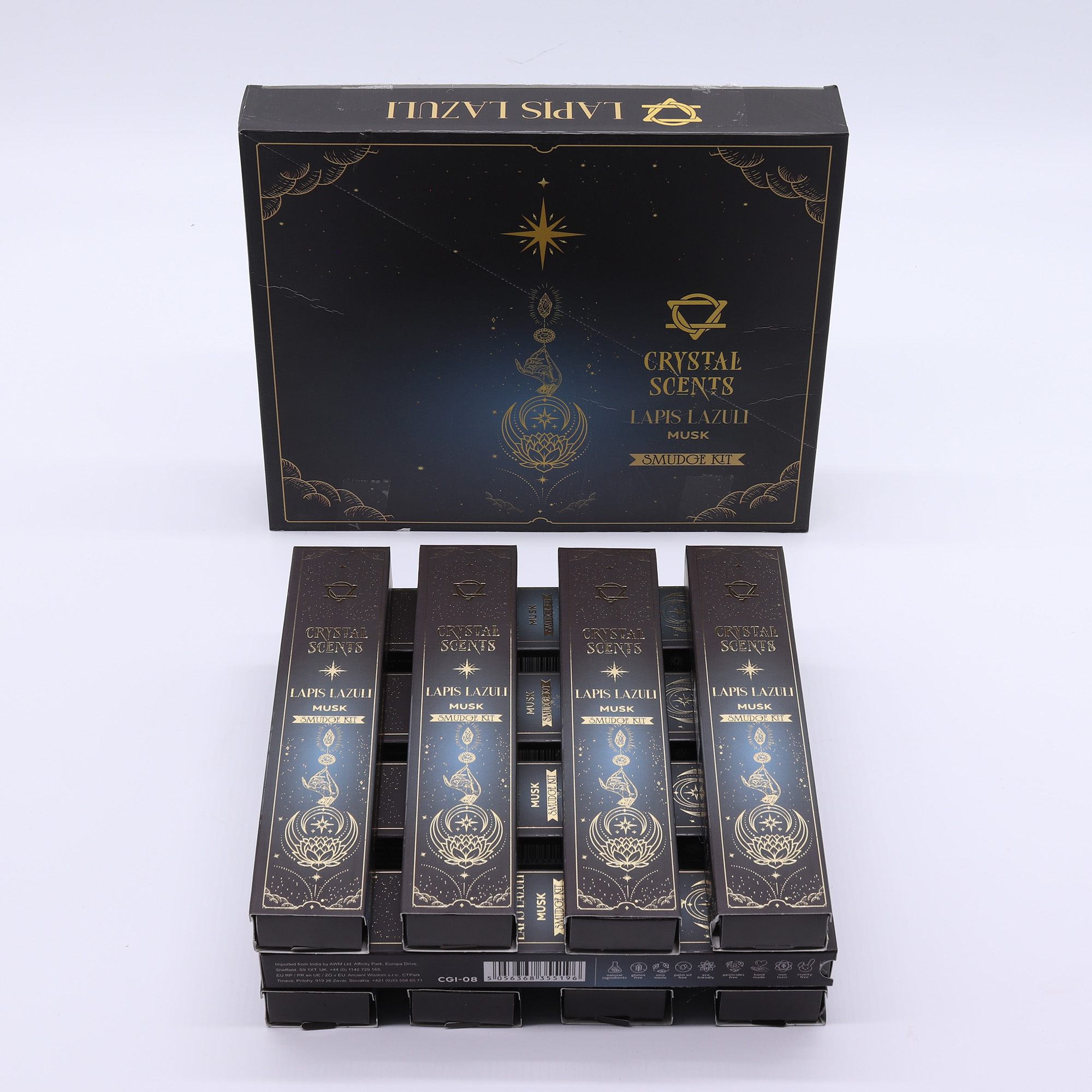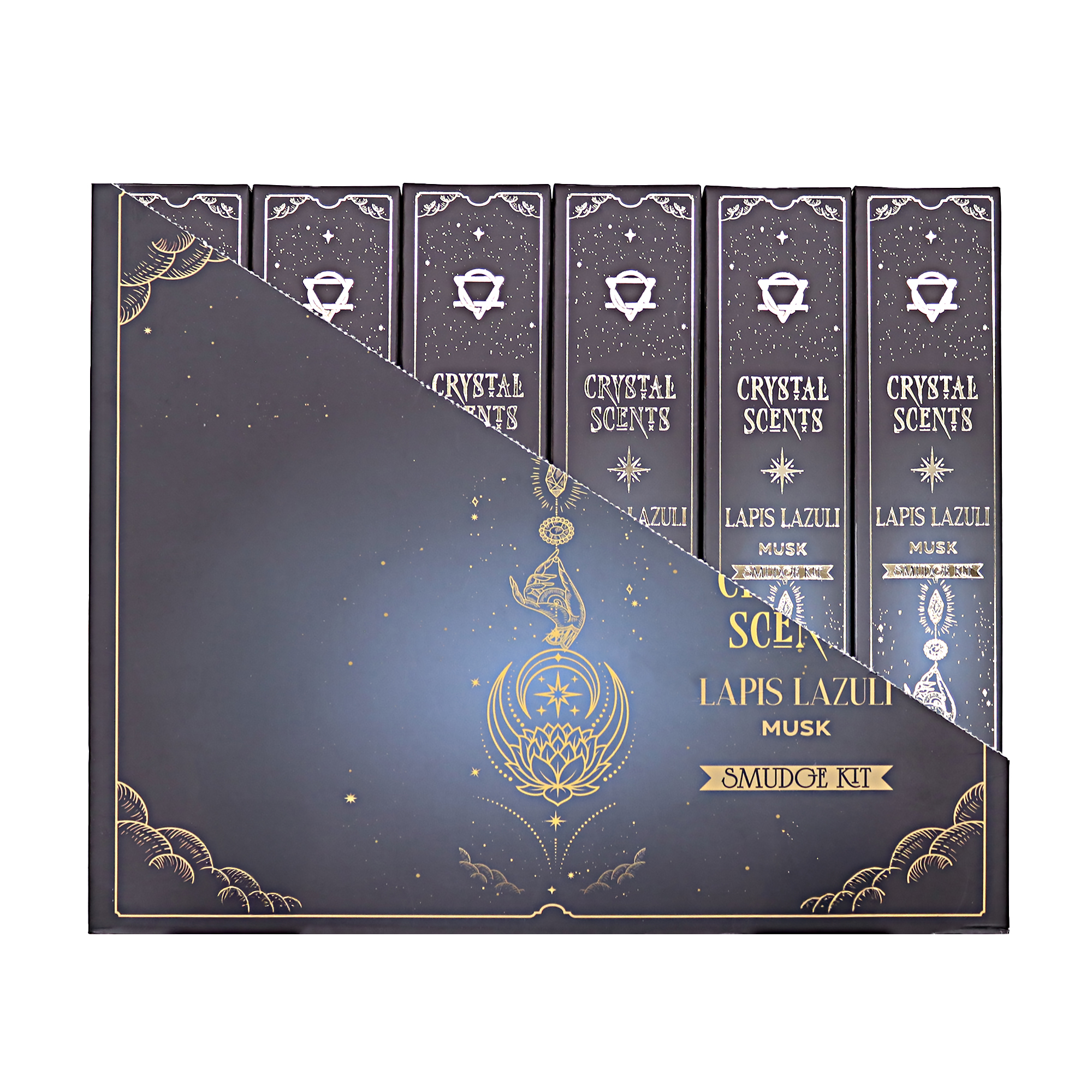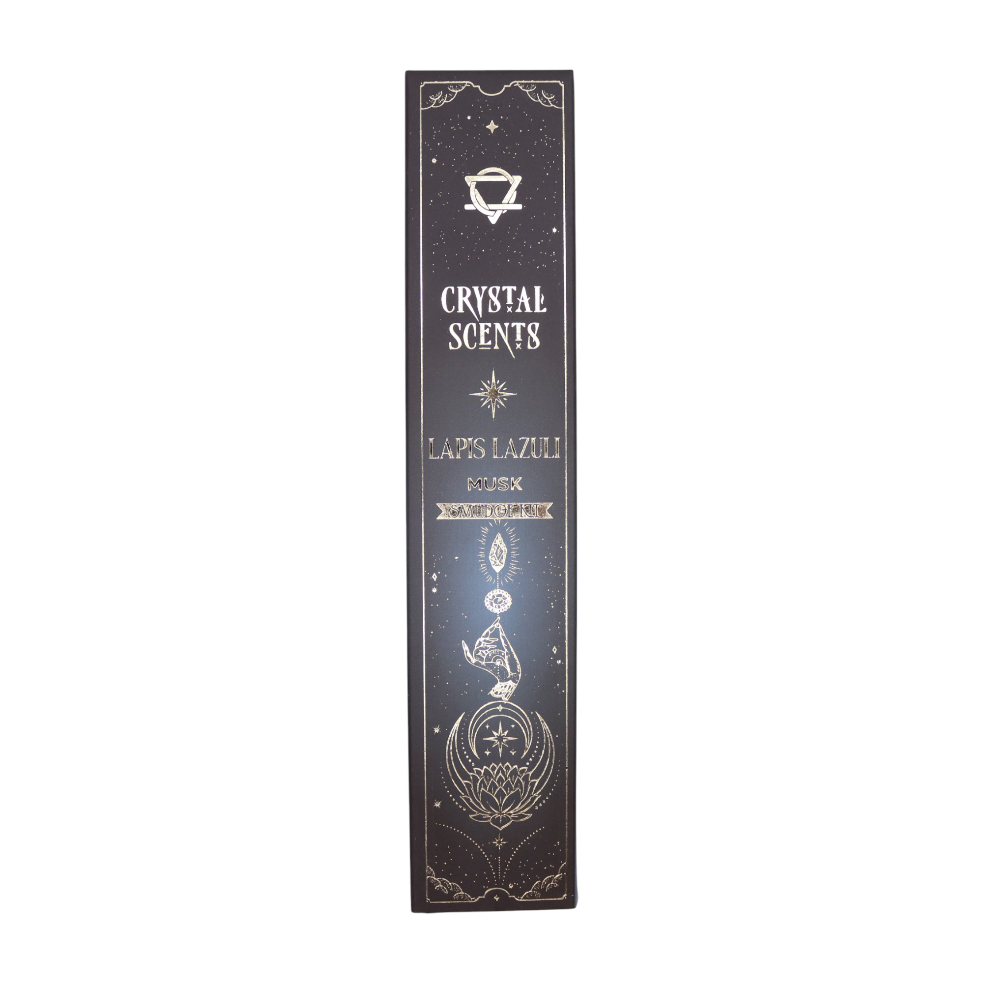 Chaque étui contient 10 bâtons d’encens artisanaux et un véritable cristal de Lapis-Lazuli, offrant un rituel complet à forte valeur perçue pour les amateurs de bien-être et de spiritualité.
