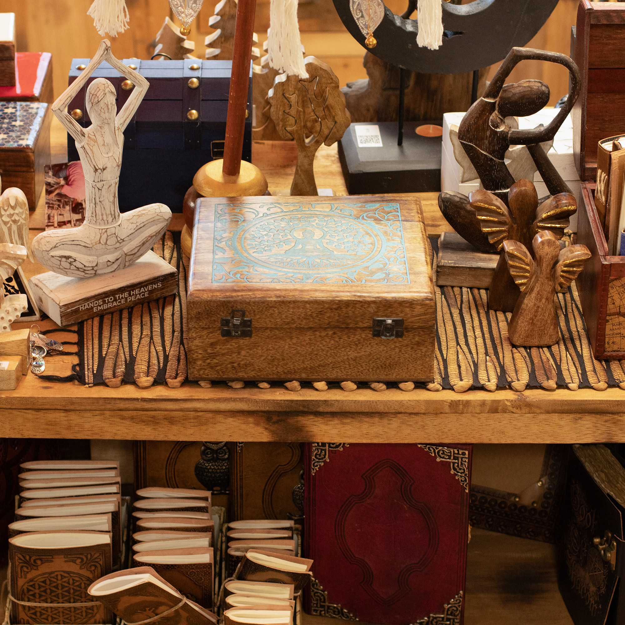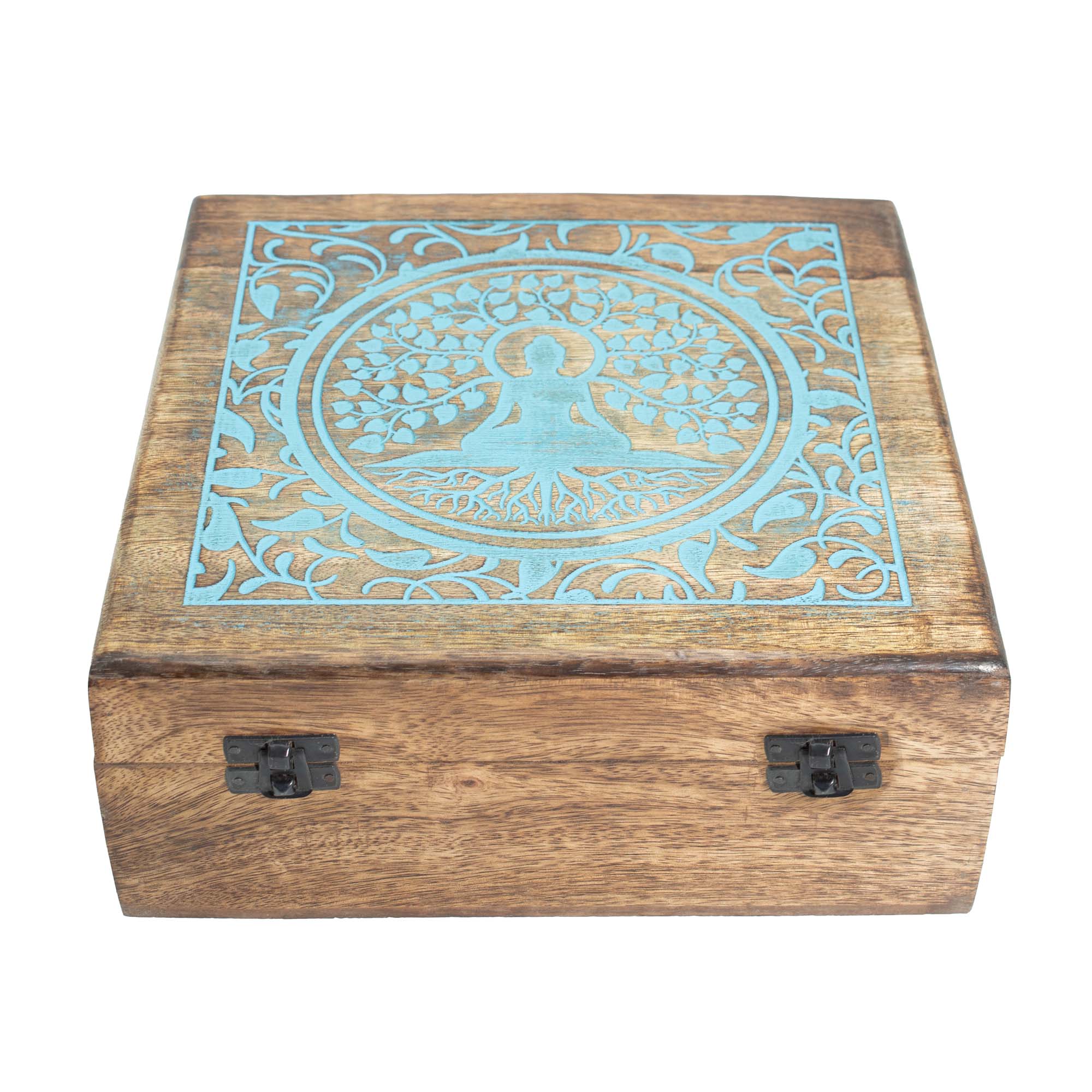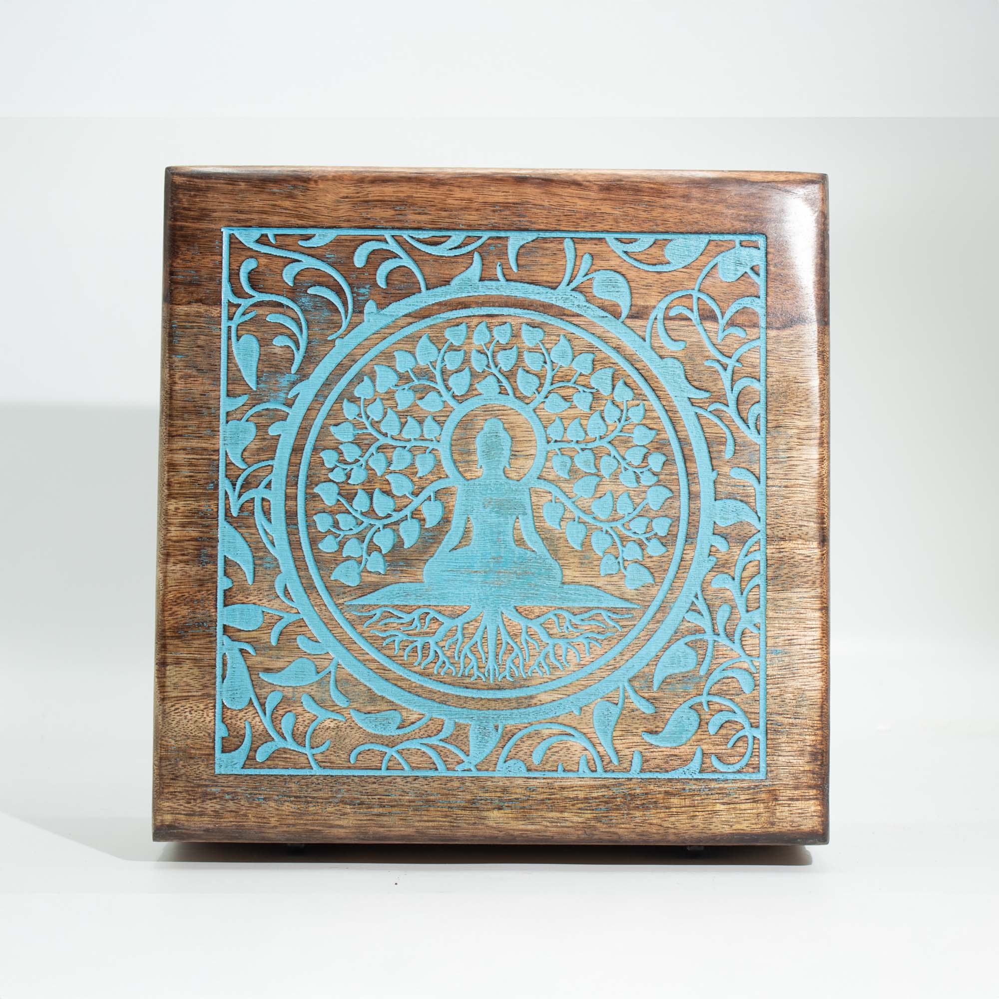 Fabriquée artisanalement en Inde et distribuée par AW Artisan France, elle allie authenticité et qualité. Son format carré généreux de 25 x 25 x 10 cm permet de ranger cartes de tarot, cristaux, bijoux ou objets rituels. Le motif de Bouddha sous l’arbre Bodhi évoque l’éveil, la sagesse et la paix intérieure, très recherchés en boutique.