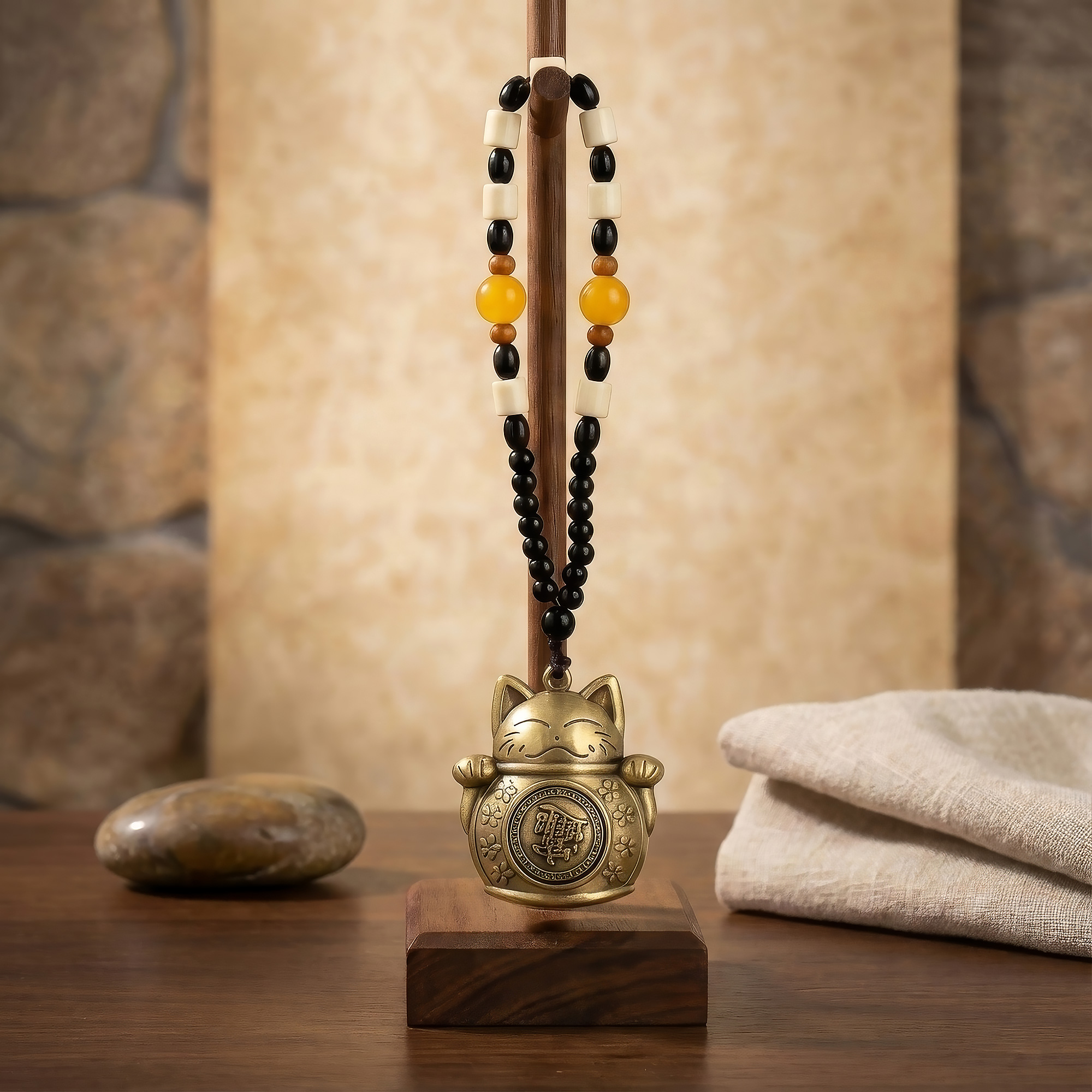 L'amulette est montée sur un cordon de perles décoratives mêlant noir, crème, bois naturel et tons ambrés, offrant un bel équilibre visuel et une harmonie de couleurs selon les principes du Feng Shui. Facile à suspendre, elle trouve naturellement sa place près d’une entrée, d’une caisse, sur un bureau, une étagère ou dans la zone richesse d’un lieu de vie ou de travail.