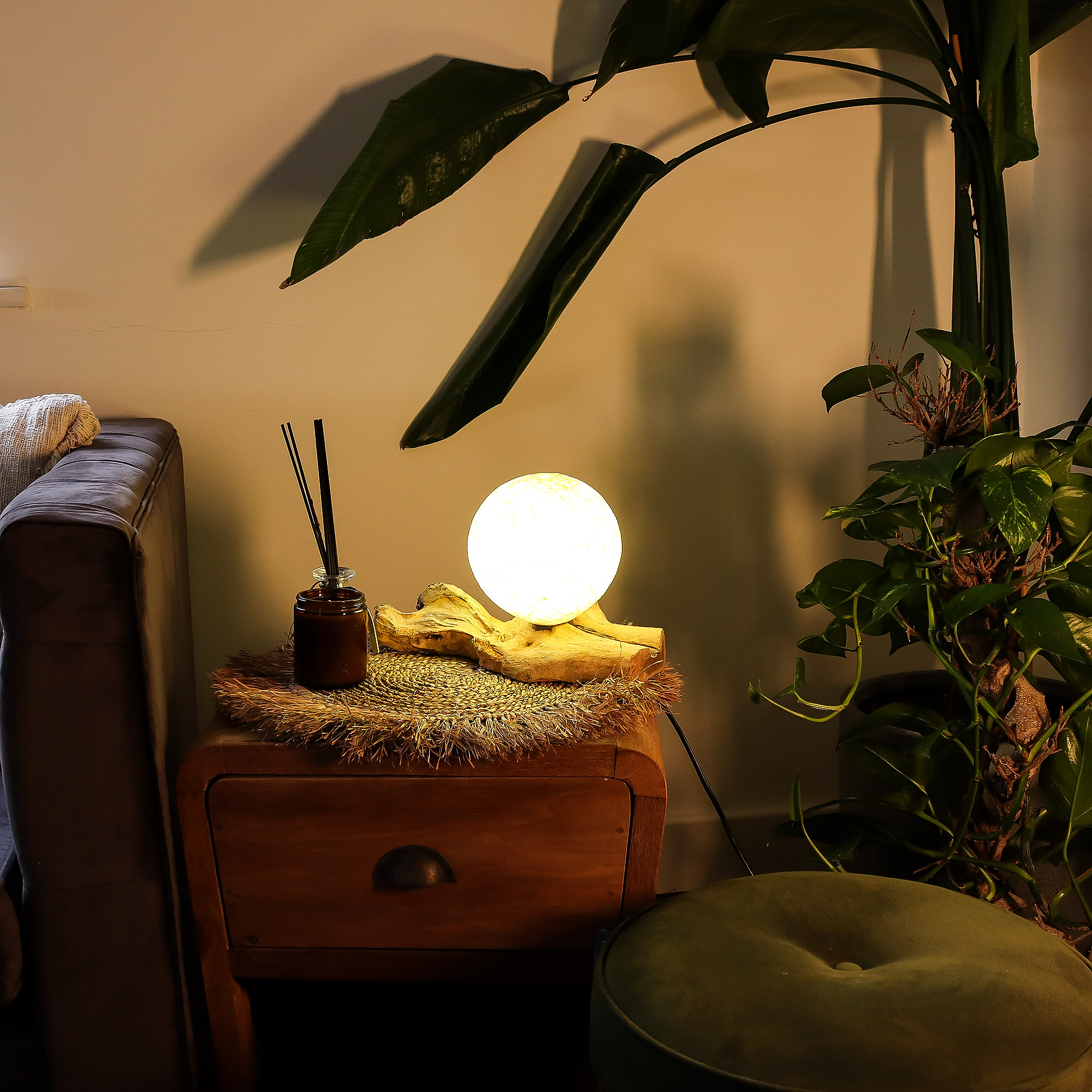 La lampe repose sur une base en bois façonnée à la main, garantissant authenticité et exclusivité : aucune pièce ne se ressemble, avec des textures et finitions singulières. Ce luminaire répond à la tendance des objets durables, organiques et uniques, idéal pour les boutiques recherchant des produits originaux et à fort impact visuel.