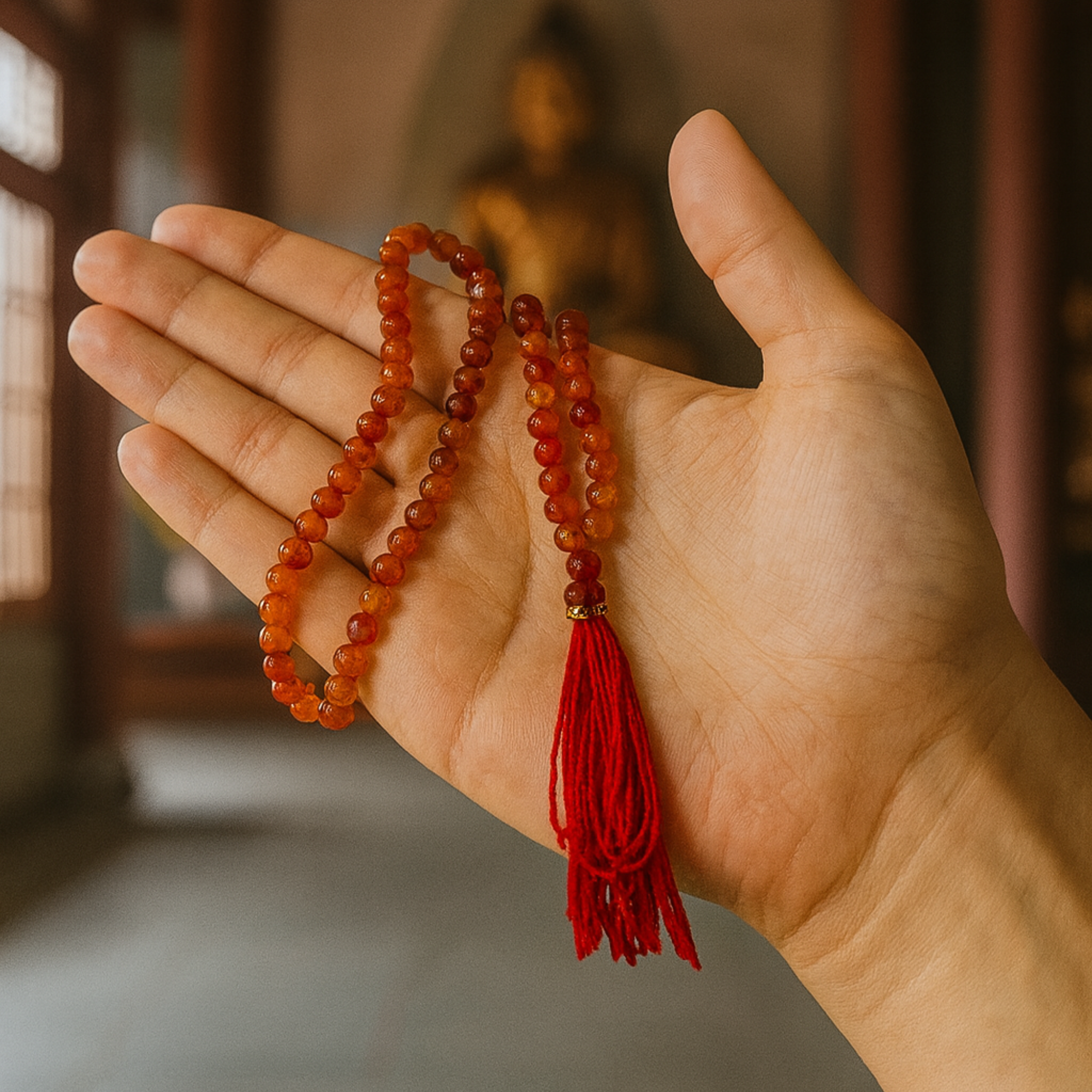 Découvrez ce collier Mala Tibétain composé de 108 perles naturelles de Cornaline, une pierre rouge-orangée vibrante reconnue pour favoriser la créativité, le courage et la passion.