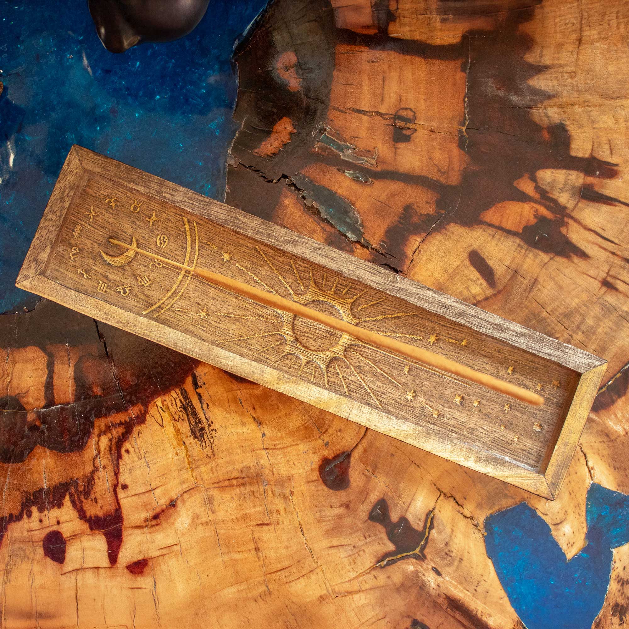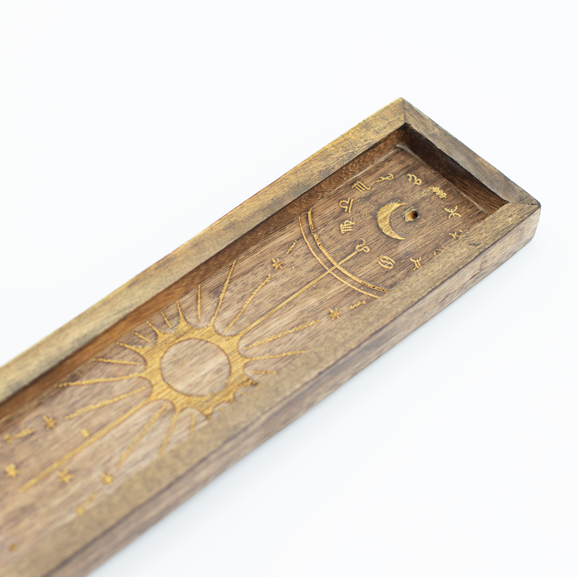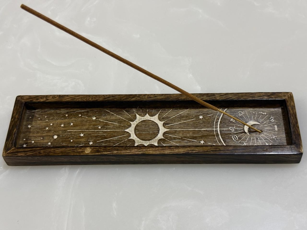 Fabriqué en bois de manguier naturel et éco-résponsable à la teinte rustique chaleureuse, chaque pièce est ornée d’un motif soleil central entouré de symboles astrologiques, finement gravés pour un rendu authentique et élégant. Le design reste discret tout en apportant une dimension symbolique forte — idéal pour compléter une offre de cristaux, d’encens ou d’articles ésotériques.