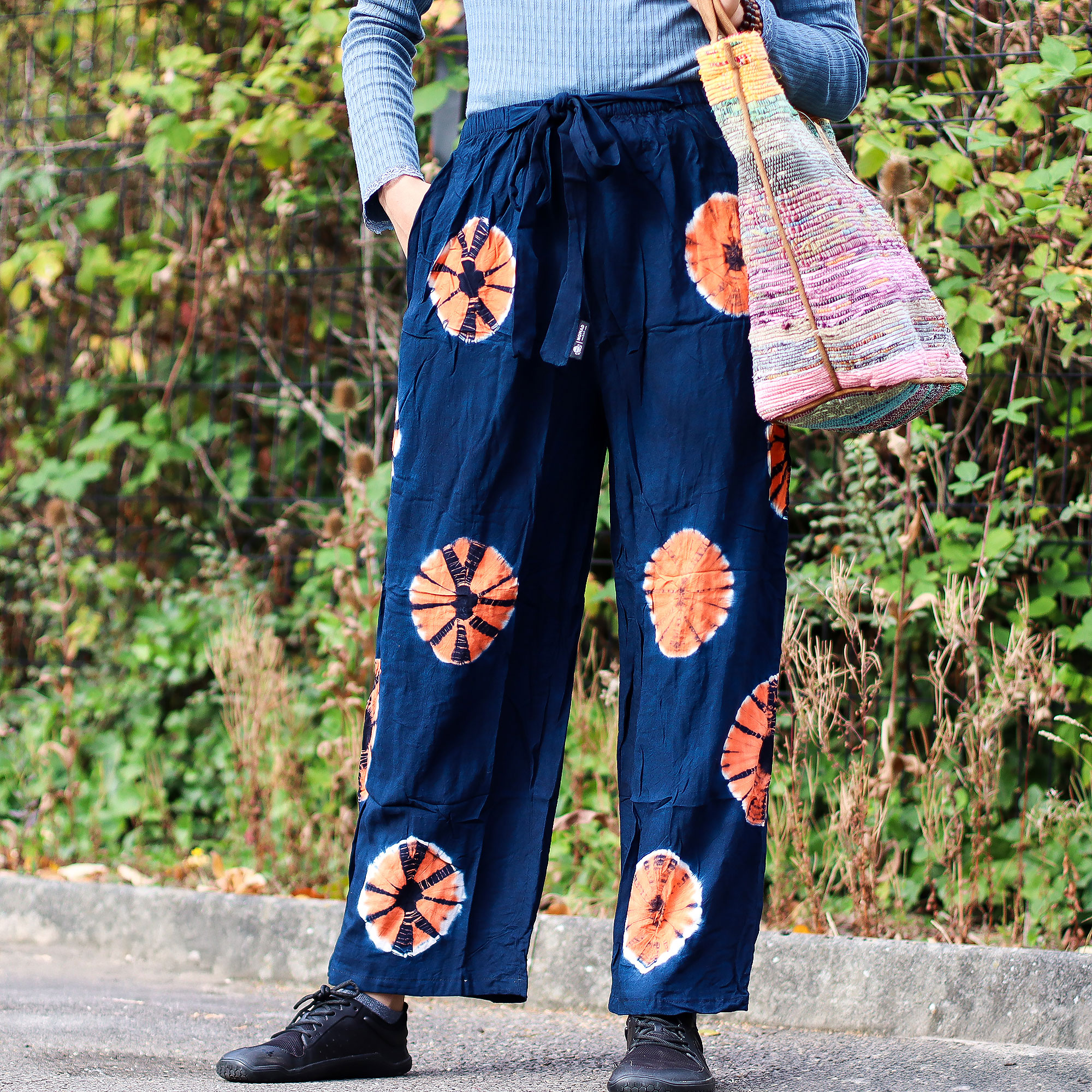 Teint selon une technique indonésienne proche du pelangi, ce pantalon est unique : aucun motif ne sera identique d’un modèle à l’autre, ce qui renforce son charme et son authenticité.