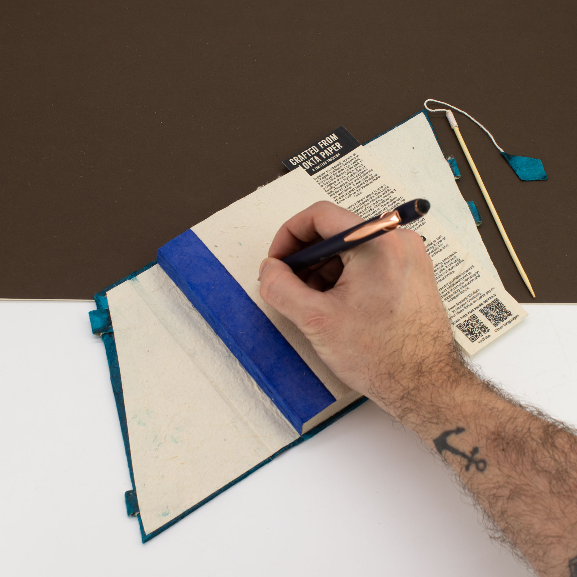 Il est composé de 45 feuilles en papier Lokta naturel, apprécié pour sa texture légèrement fibreuse, sa solidité et son aspect authentique. Issu de fibres végétales récoltées durablement dans l’Himalaya, ce papier s’inscrit dans une démarche écologique et responsable.