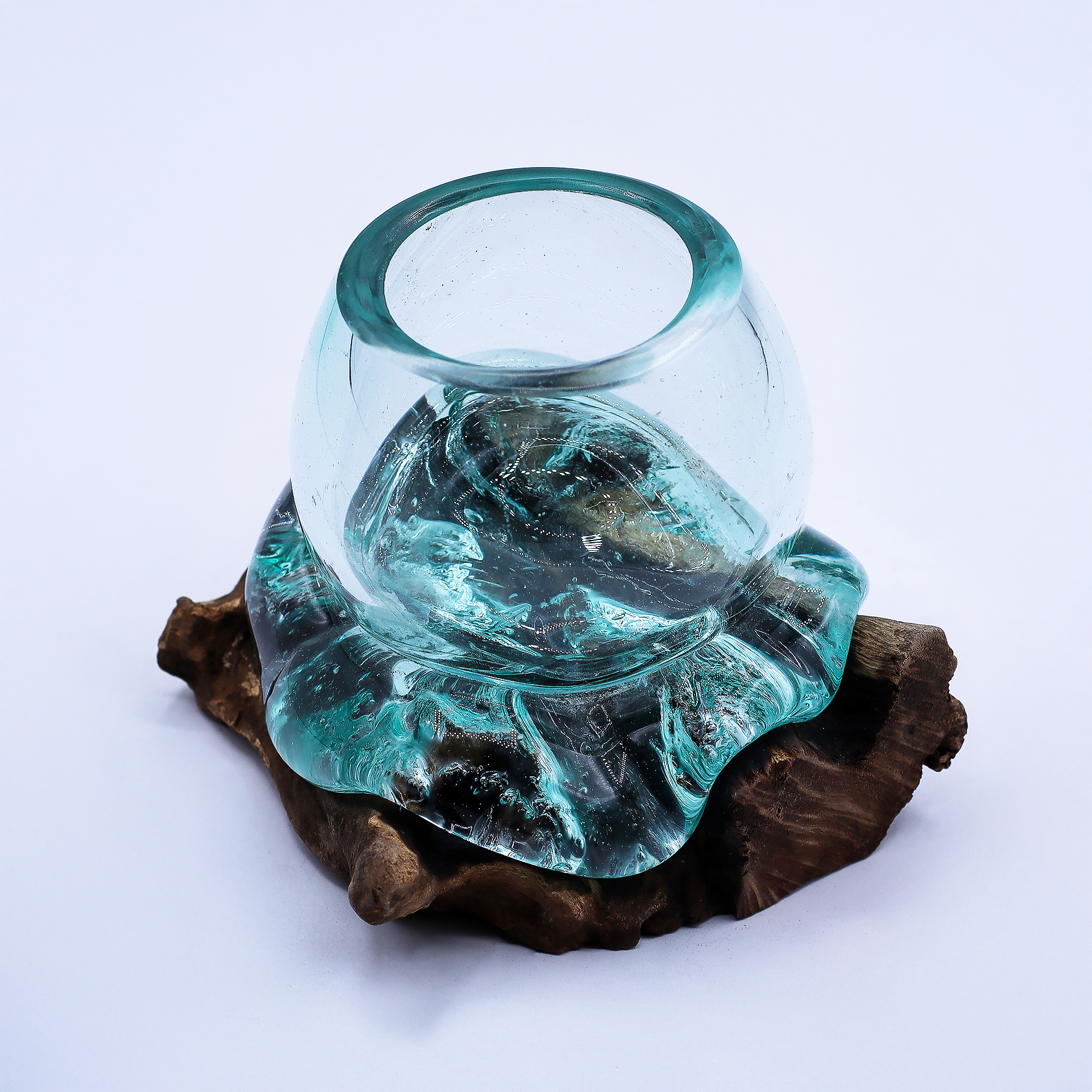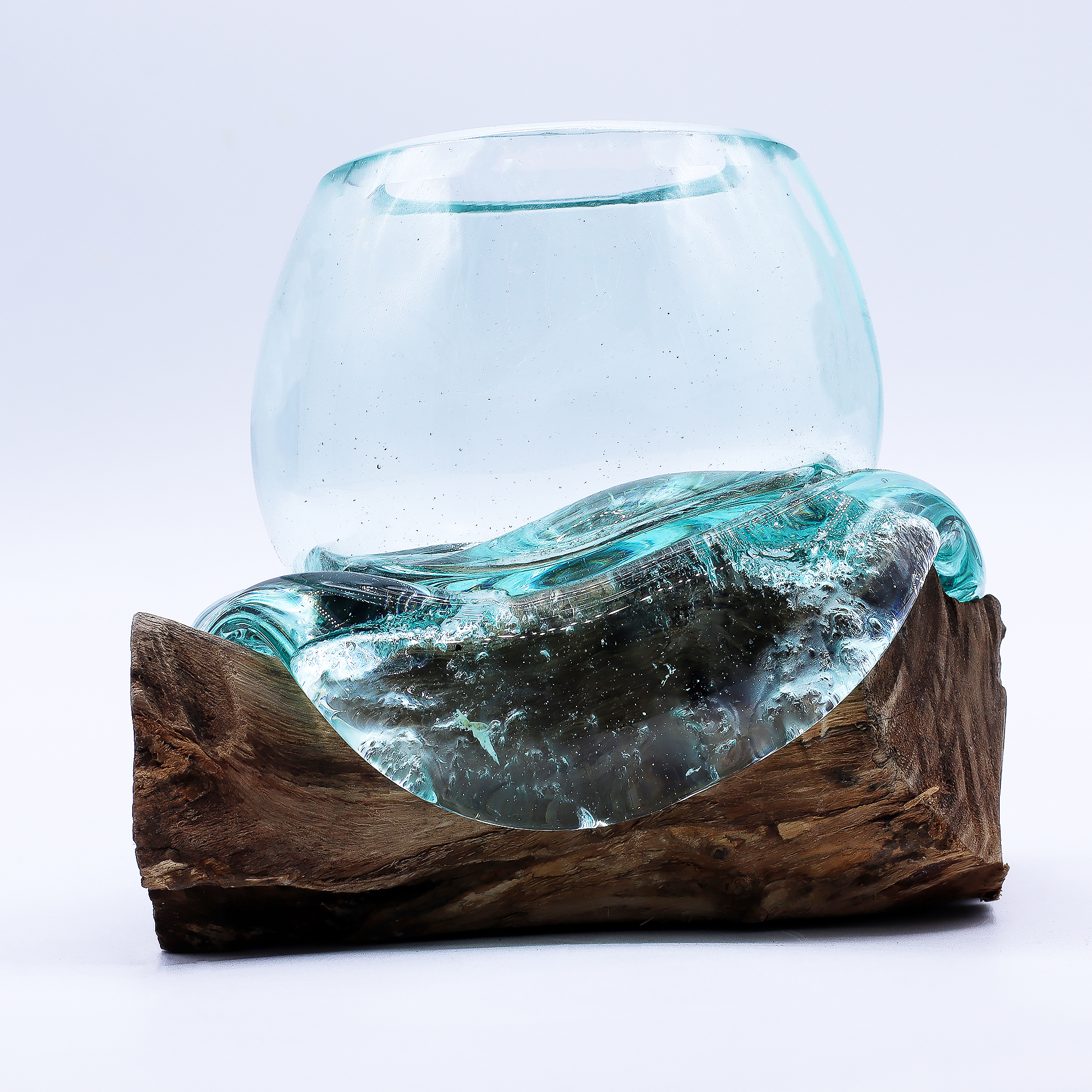 Le saviez-vous ? En Indonésie, la technique du verre fondu sur racine est un savoir-faire artisanal unique : les artisans chauffent le verre soufflé jusqu’à ce qu’il devienne malléable, puis le posent directement sur une racine de bois naturelle. Sous l’effet de la chaleur, le verre épouse parfaitement les formes du bois, créant une pièce totalement unique, impossible à reproduire à l’identique. Cette méthode, transmise de génération en génération, symbolise l’harmonie entre les éléments – le feu qui façonne le verre et la terre qui offre le bois.