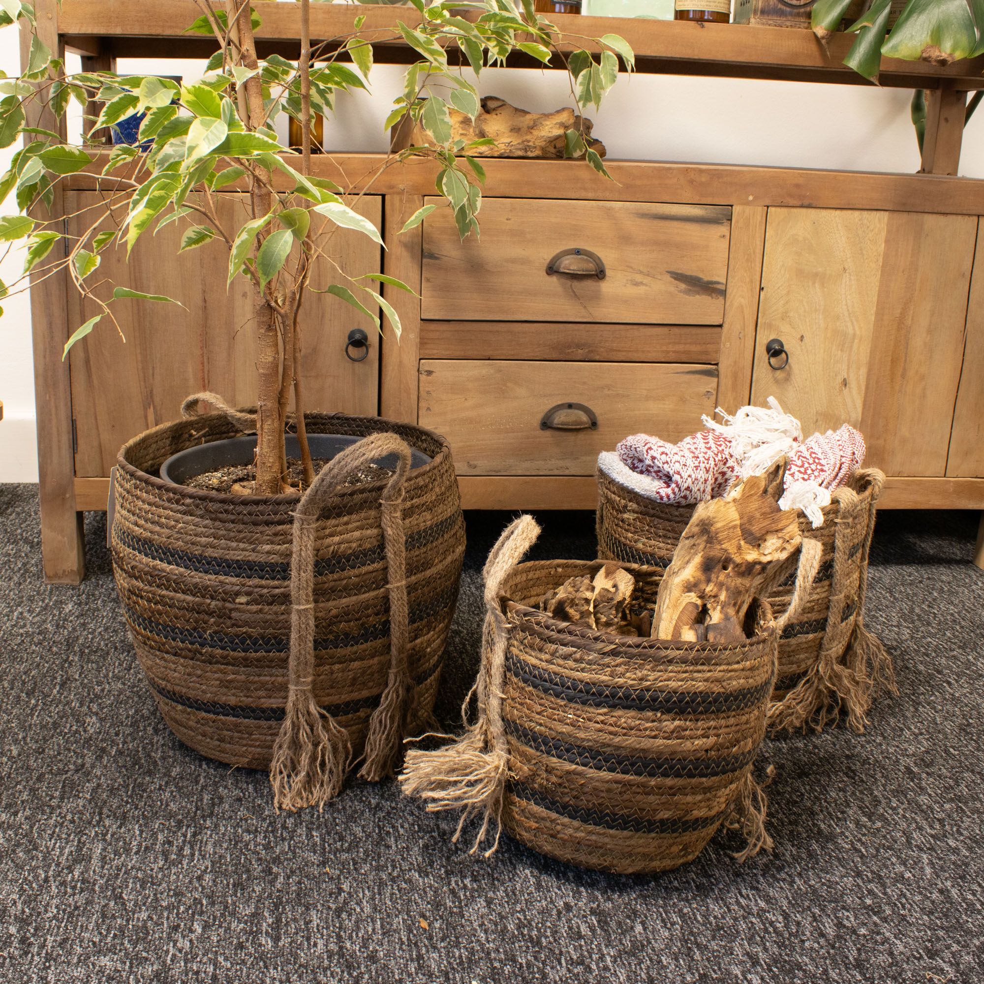 Set de 3 paniers artisanaux en feuille de bananier et jonc de mer, aux tons bruns naturels avec motifs tressés. Un design authentique et chaleureux, parfait pour une ambiance bohème, ethnique ou naturelle en boutique.