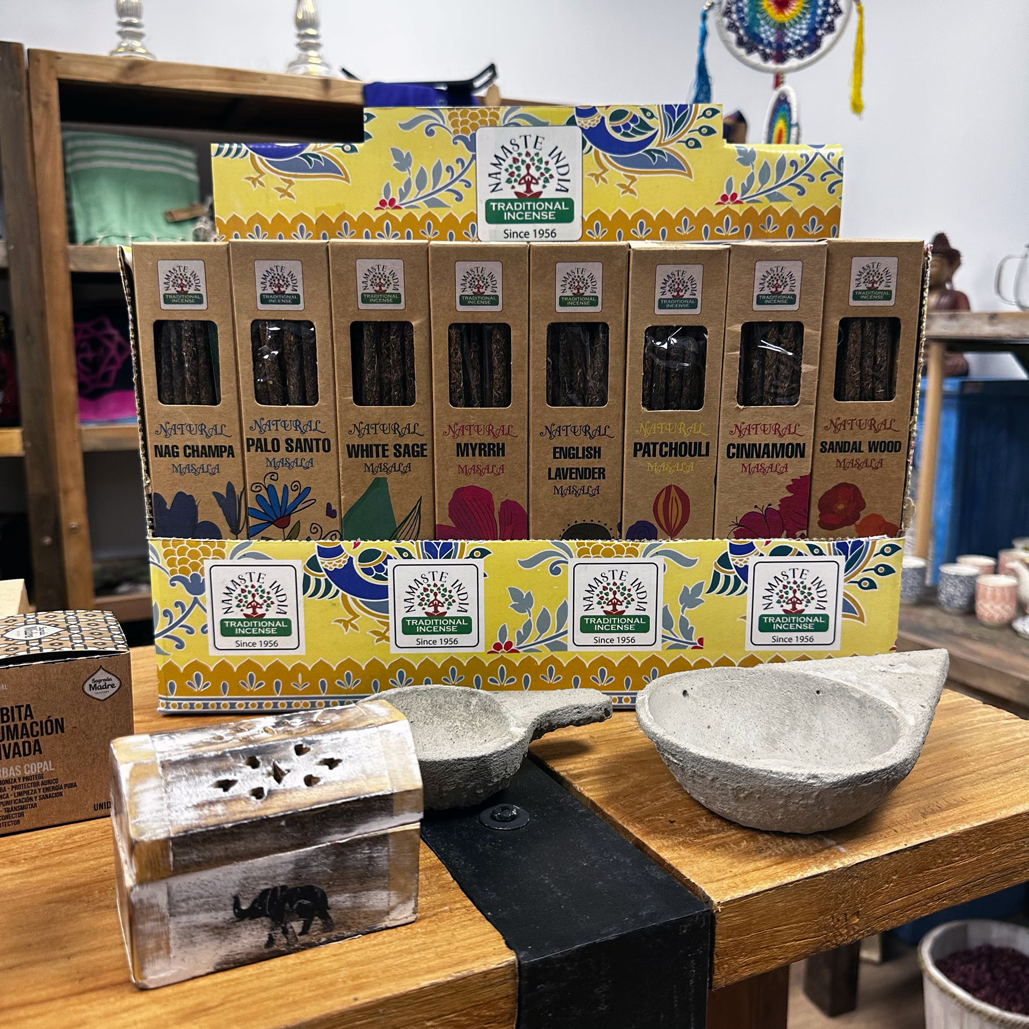 Découvrez une sélection exclusive et artisanale d’encens Masala, fabriquée à la main en Inde, spécialement choisie pour ta boutique. Ce présentoir offre 48 boites (11 bâtonnets environ par boite) d'encens Masala répartis en 8 parfums soigneusement sélectionnés : Palo Santo, Cannelle, Lavande Anglaise, Patchouli, Sauge Blanche et Bois de Santal, Nagchampa et Myrrhe. Chaque parfum capture l’essence d’un rituel ancestral et légendaire, mêlant herbes naturelles, poudres de bois et huiles essentielles pour une expérience qui fera voyager les sens de vos clients.