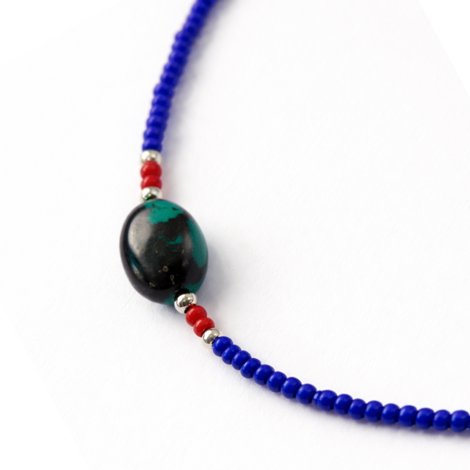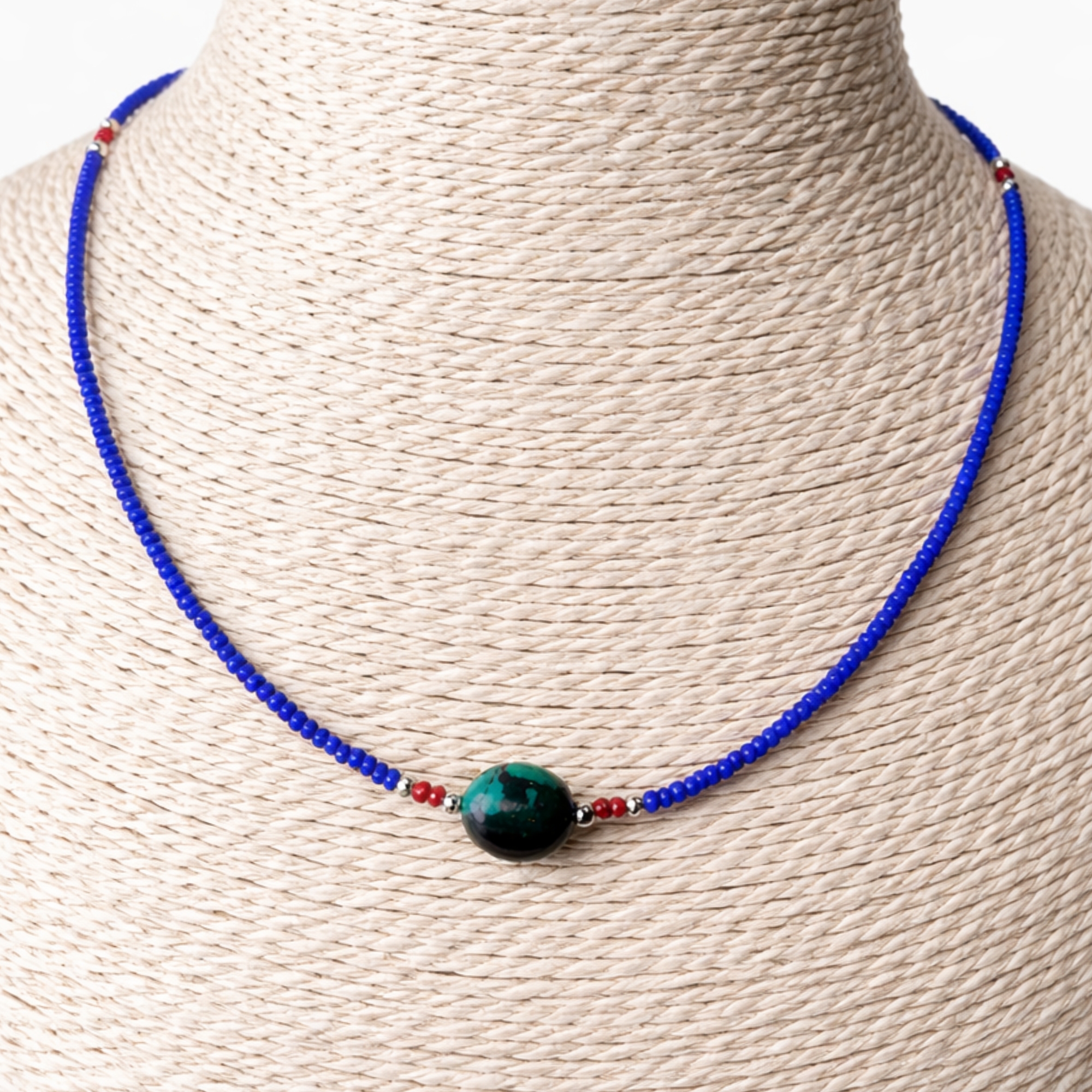 Monté sur une rangée de petites perles de lapis bleu intense, le collier est sublimé par un pendentif central en turquoise, accompagné de petites perles rouges qui rappellent les bijoux traditionnels himalayens. Son style fin et minimaliste le rend facile à porter au quotidien tout en conservant une touche ethnique et artisanale.