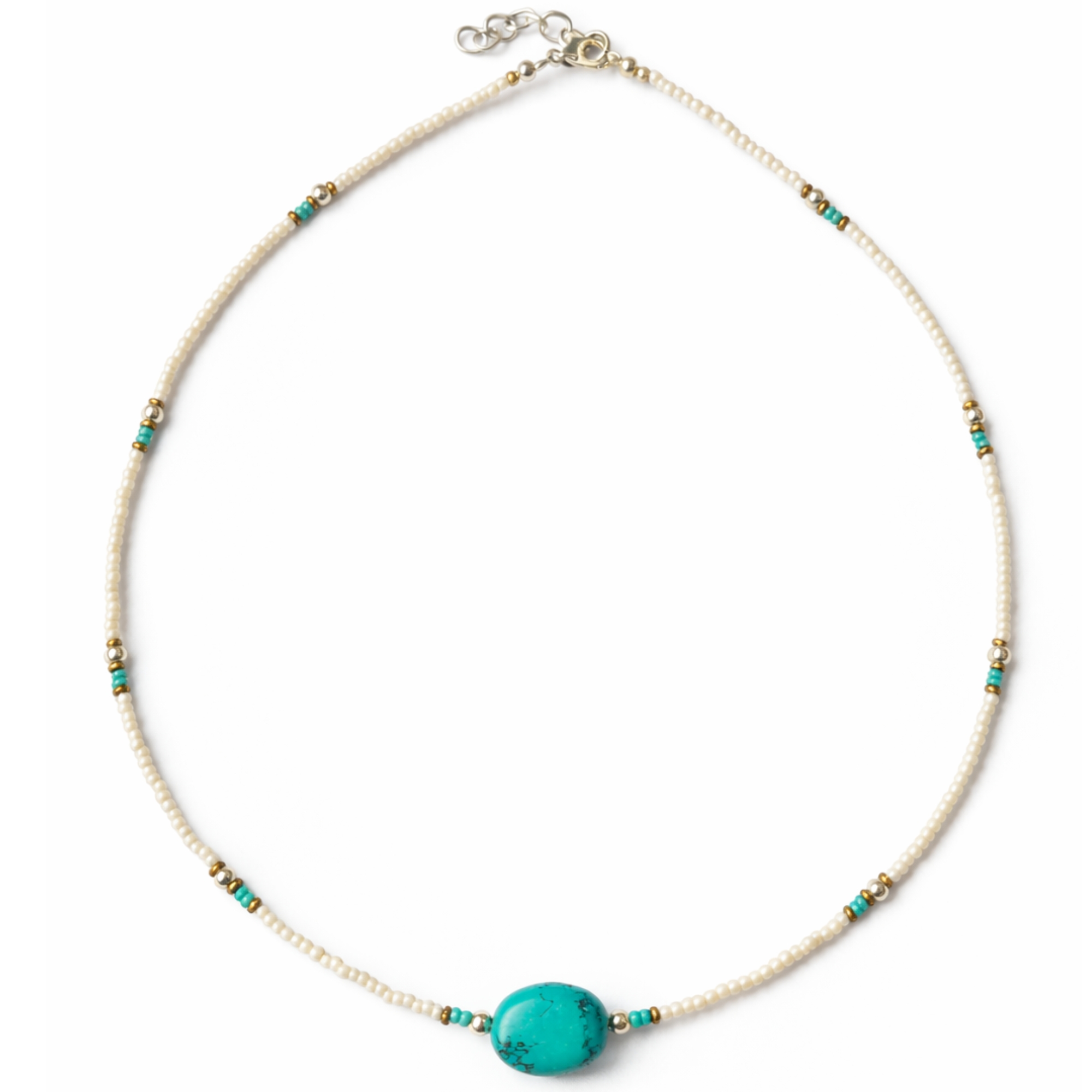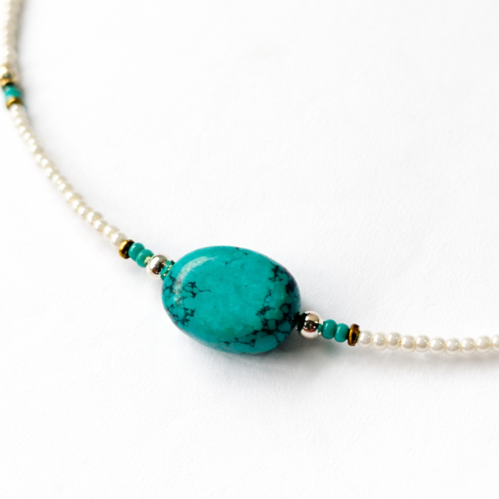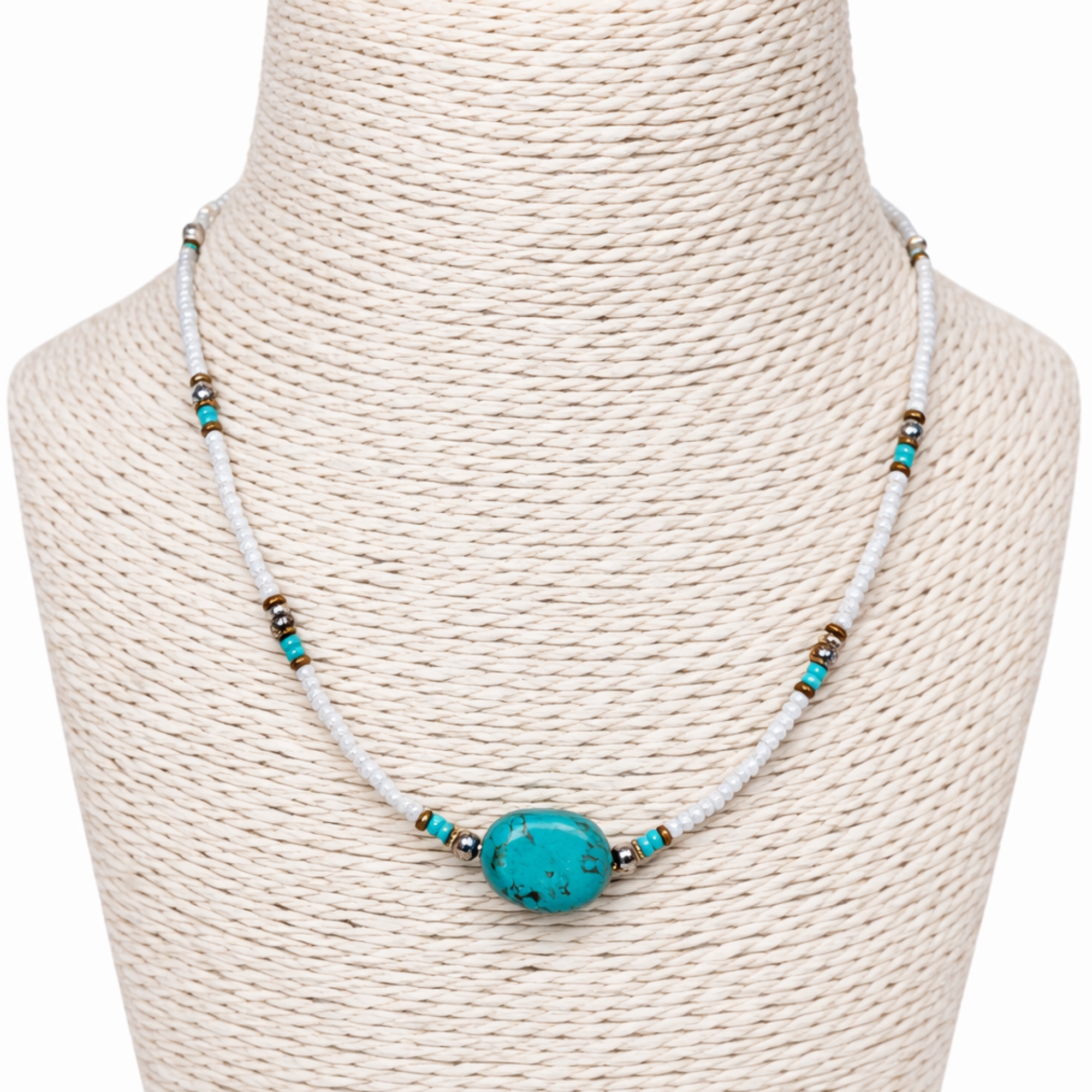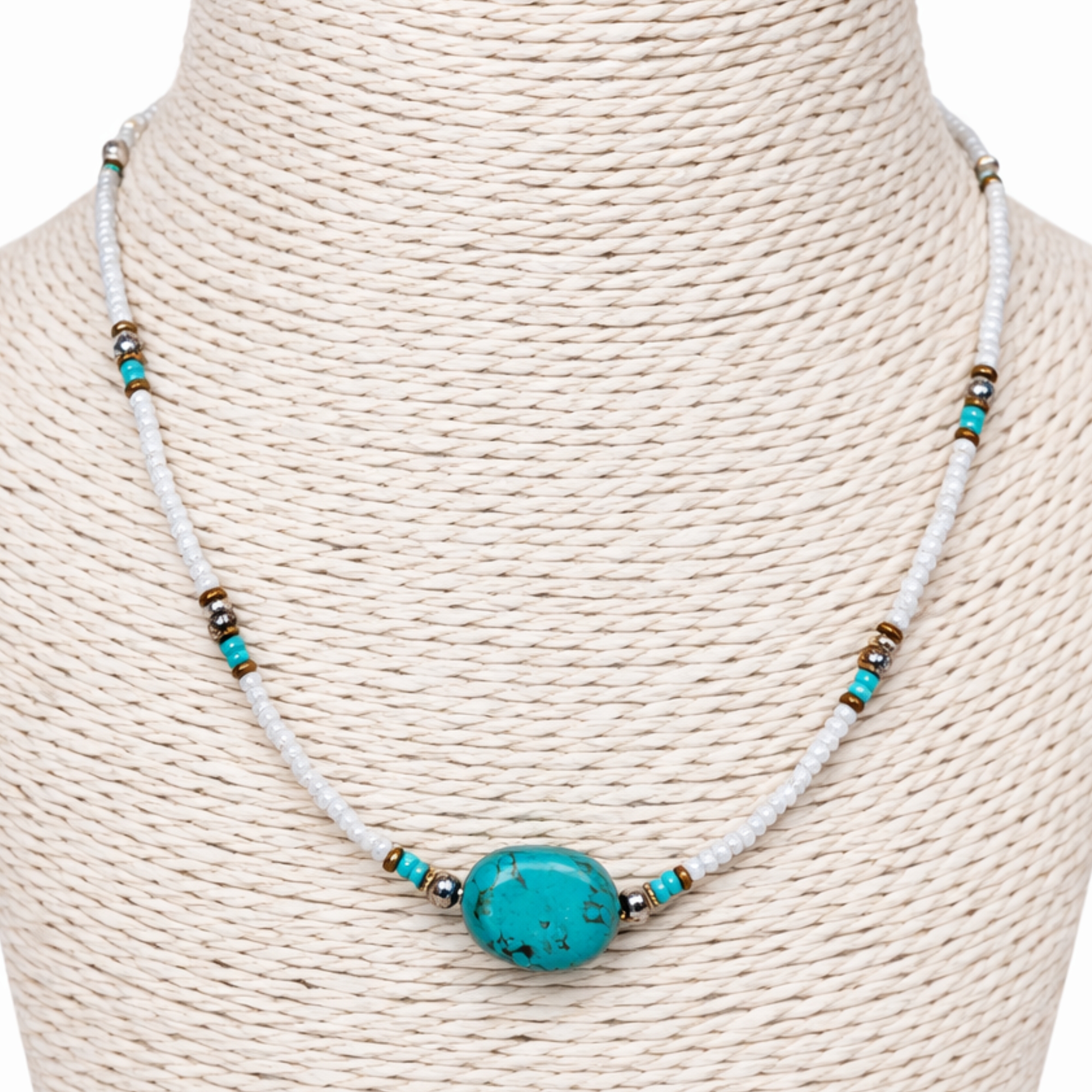 Les perles blanches de howlite, élégantes et lumineuses, créent un contraste naturel avec le pendentif central en turquoise, pierre appréciée depuis des siècles dans les cultures asiatiques pour sa beauté et sa symbolique protectrice. De petites perles décoratives viennent rythmer le collier et lui donner un style ethnique délicat et équilibré.