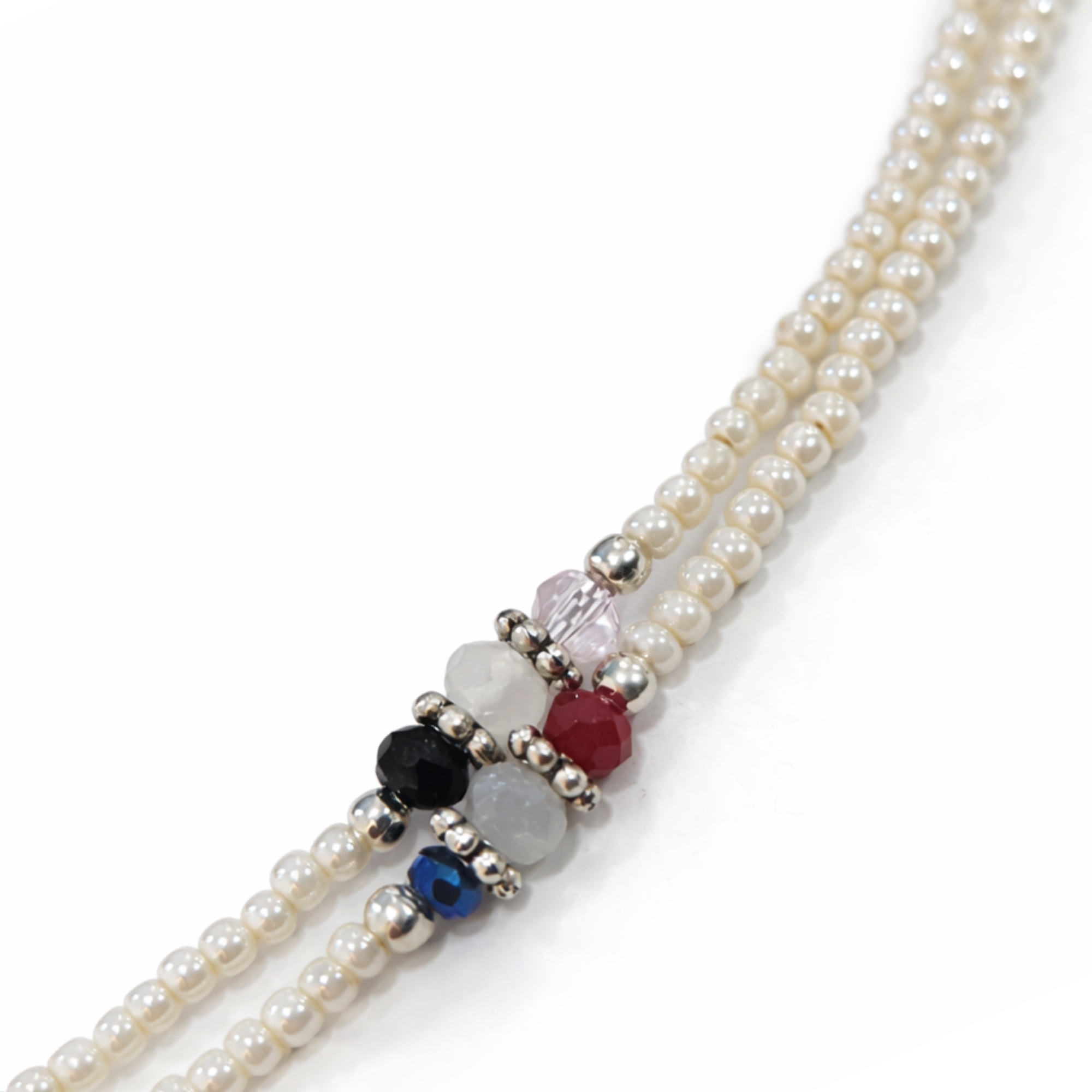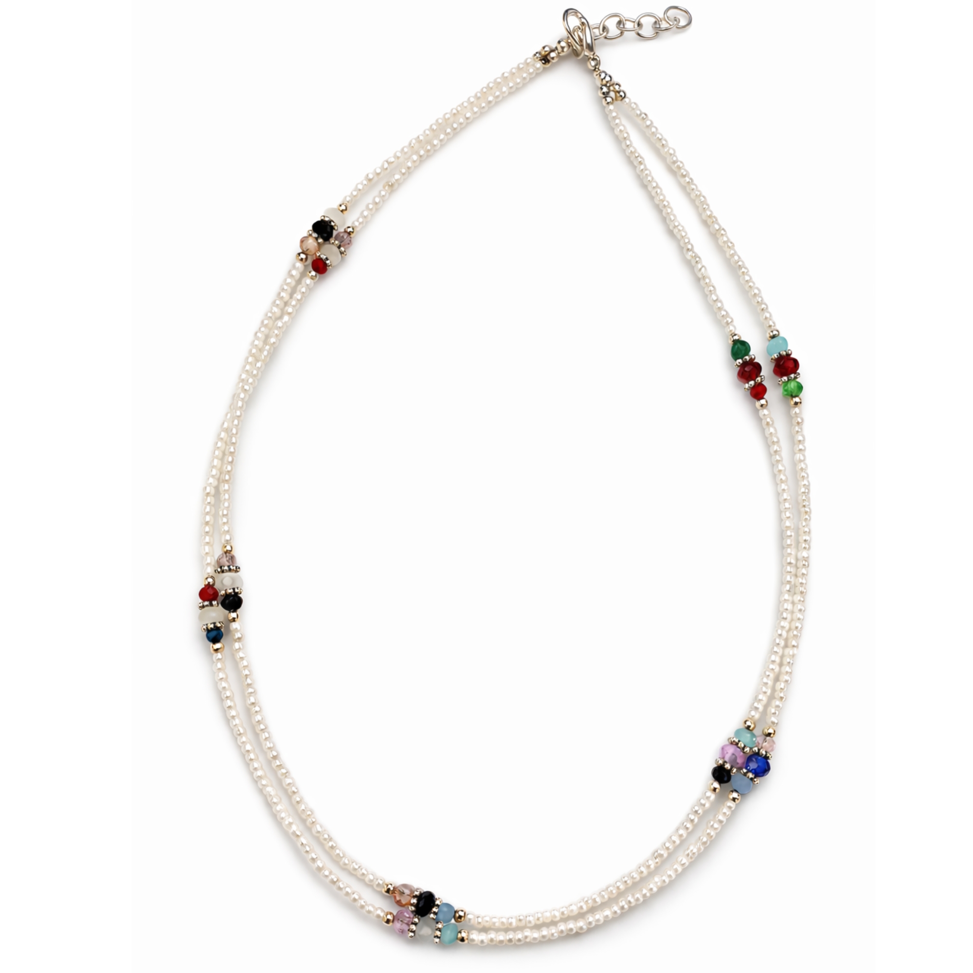 Ses fines perles de howlite blanche, douces et lumineuses, évoquent la pureté de la pierre naturelle. Elles sont délicatement ponctuées de petites perles facettées colorées qui captent la lumière et apportent une touche subtilement vibrante à l’ensemble. Le double rang donne au collier une présence élégante tout en conservant une grande légèreté.
