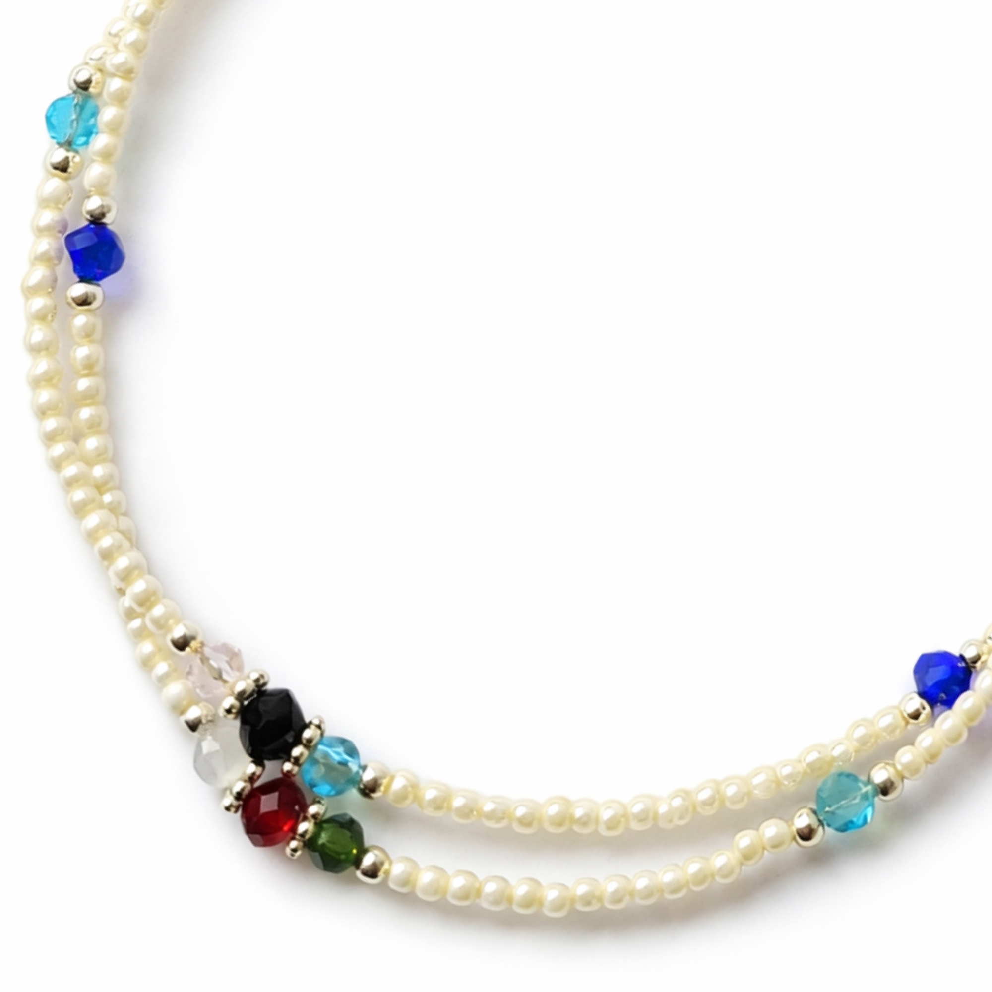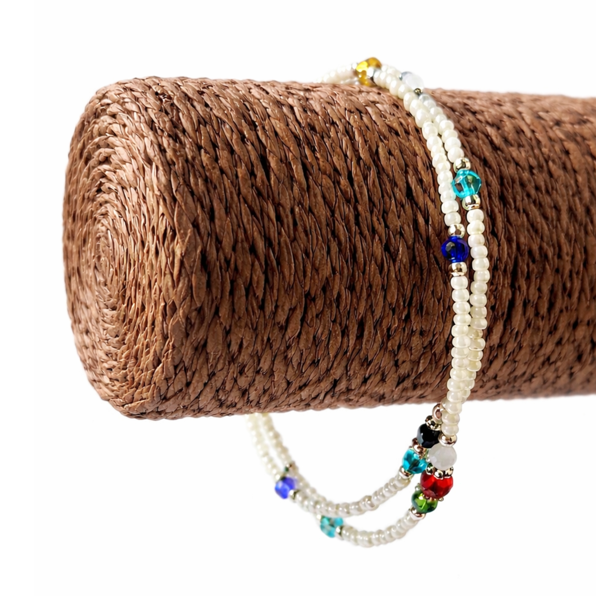 Composé de fines perles de howlite blanche, ce bijou délicat est ponctué de petites perles facettées colorées qui captent la lumière et apportent une touche vive et joyeuse. Son double rang élégant souligne la cheville avec finesse et crée un style à la fois bohème, estival et naturel.