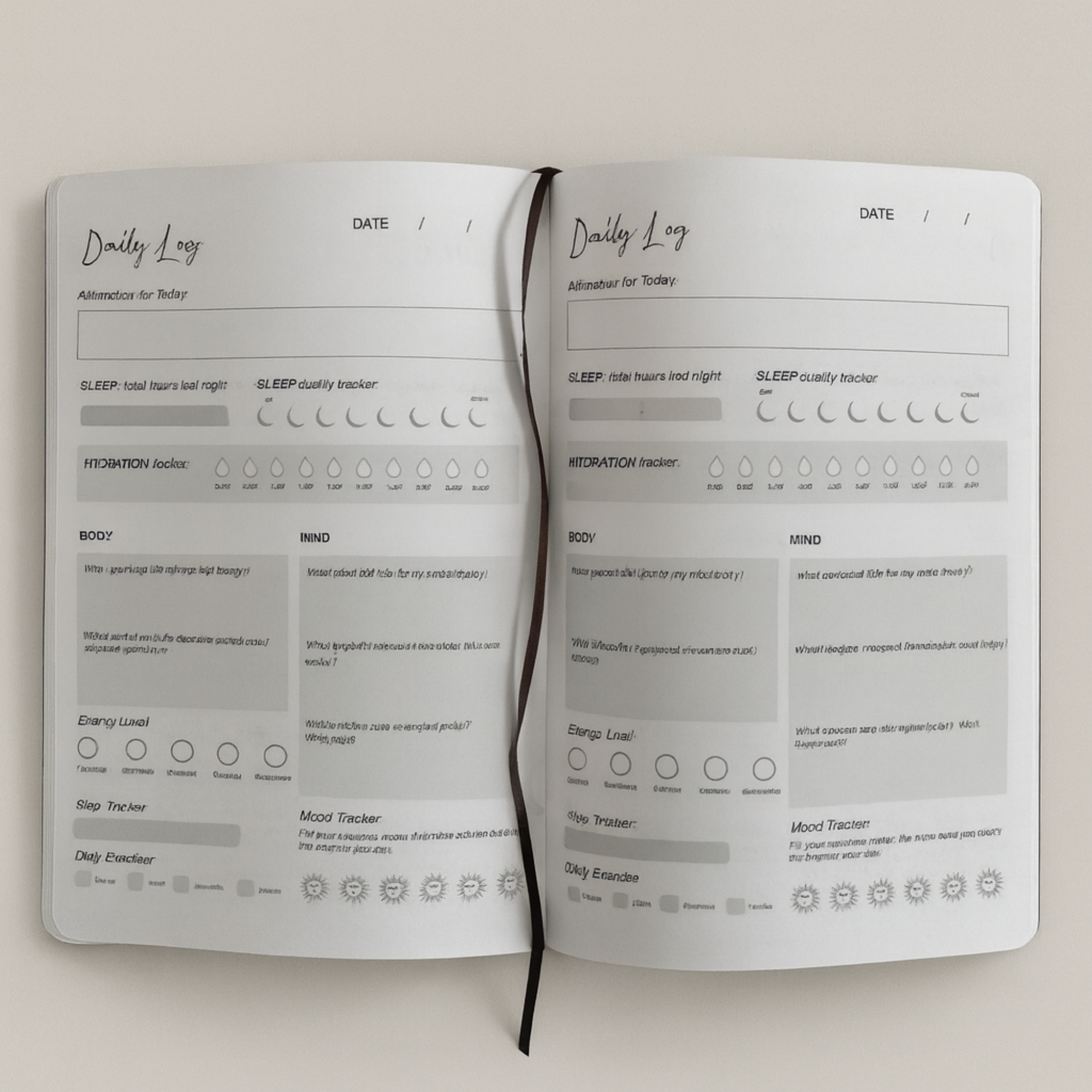 Épuré et symbolique, ce journal de bien-être blanc & or célèbre la force et la croissance intérieure. Sa couverture rigide ornée d’un Arbre de Vie doré, symbole universel d’harmonie, d’équilibre et de renaissance, instaure une atmosphère relaxante.