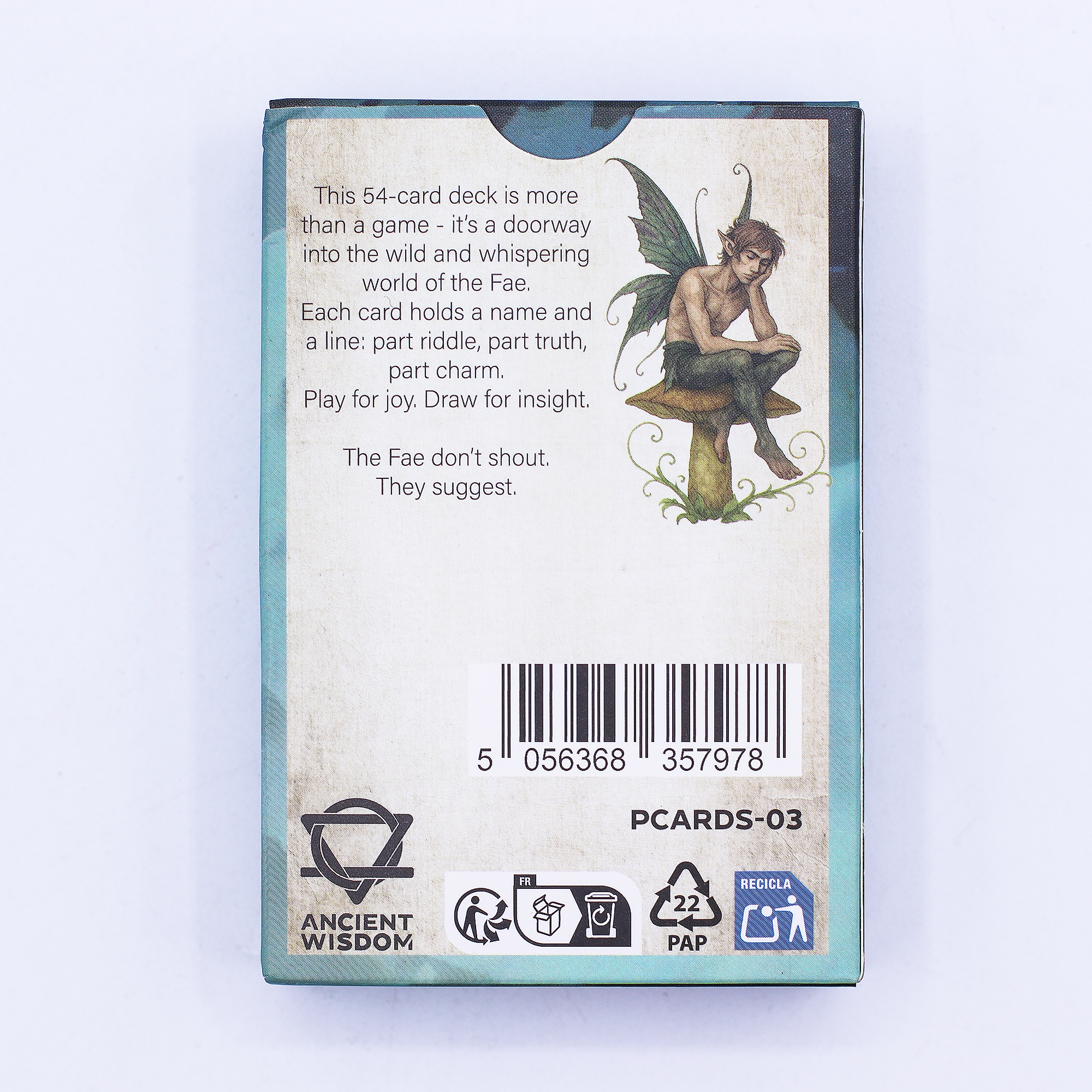 Le jeu contient 52 cartes + 2 jokers, imprimées sur un papier de qualité supérieure pour une manipulation fluide et durable. Les illustrations délicates, aux tons éthérés et mystiques, offrent une véritable immersion dans le monde féerique — idéal pour jouer, collectionner ou pratiquer des lectures symboliques légères.