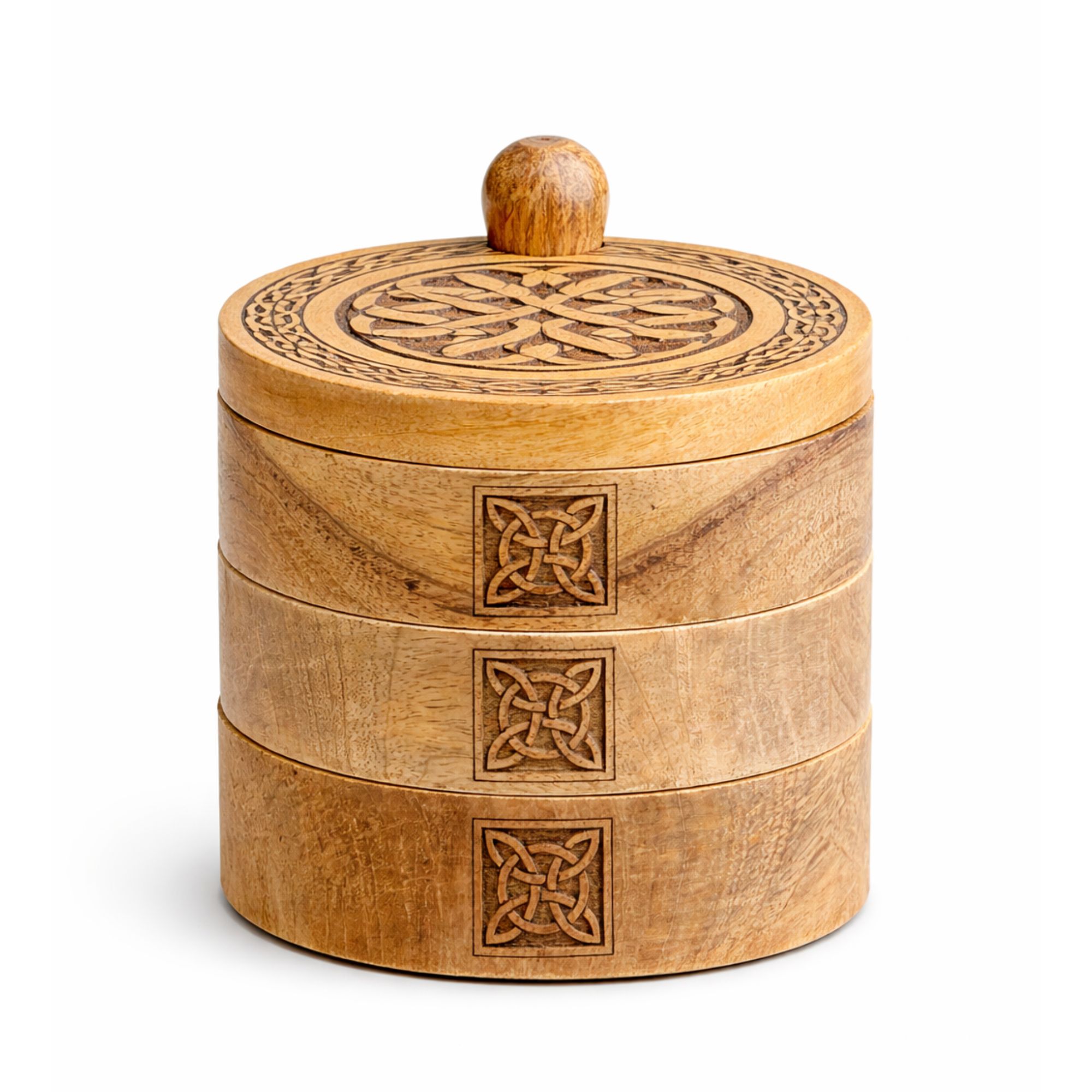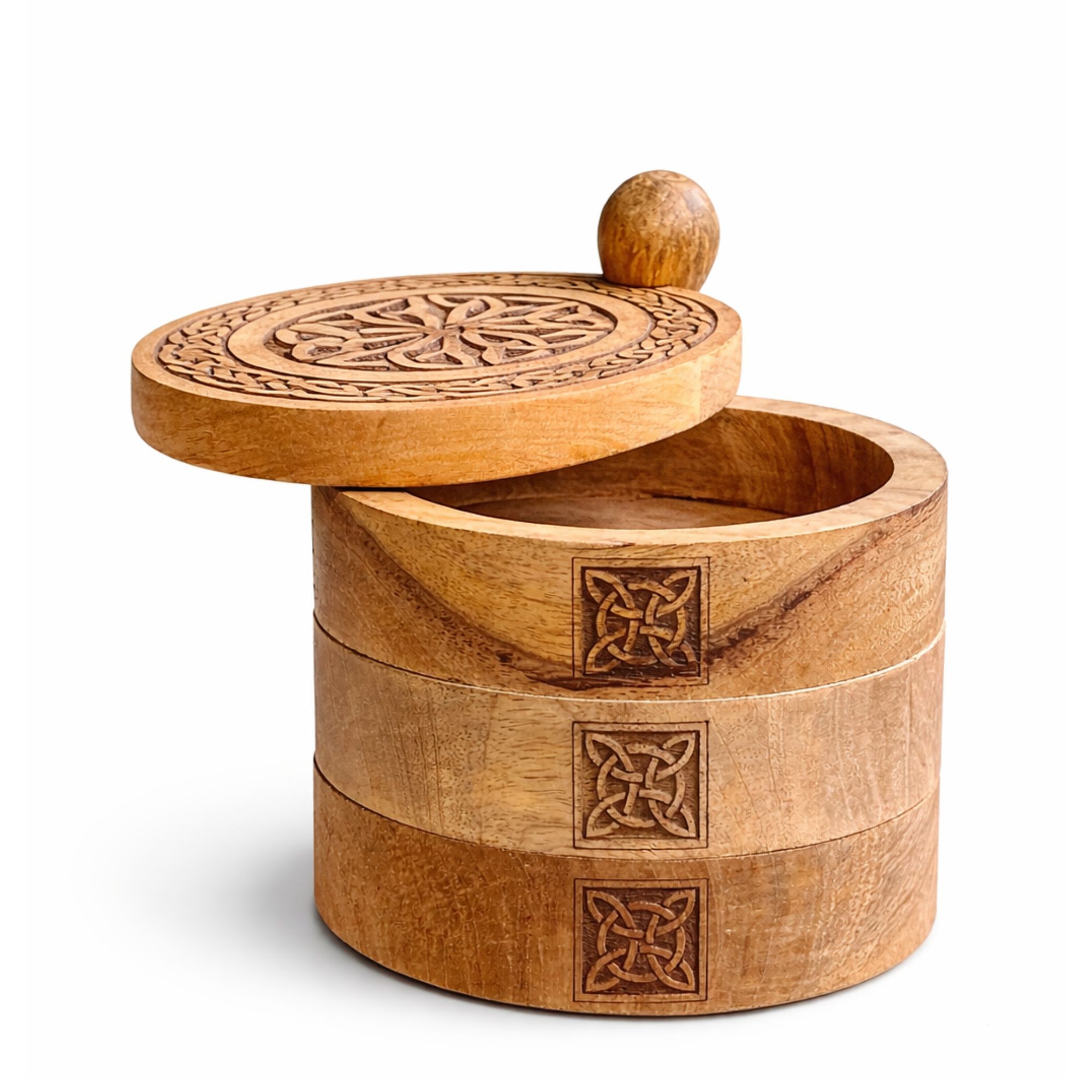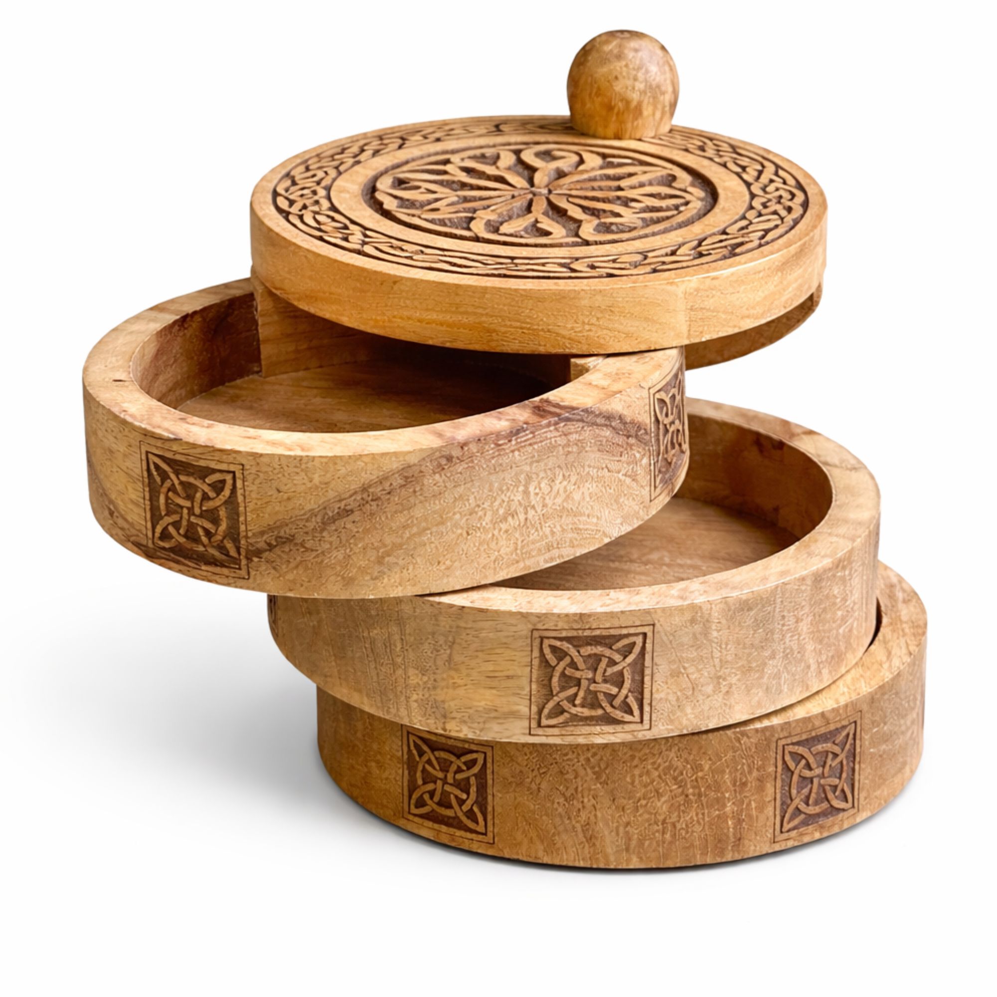 Apportez une touche d’originalité et de symbolisme à votre offre avec cette boîte celtique sculptée à 3 niveaux rotatifs, entièrement fabriquée à la main en Inde. Son design ingénieux en étages pivotants permet de révéler progressivement plusieurs compartiments, alliant fonctionnalité et effet “waouh” en boutique.