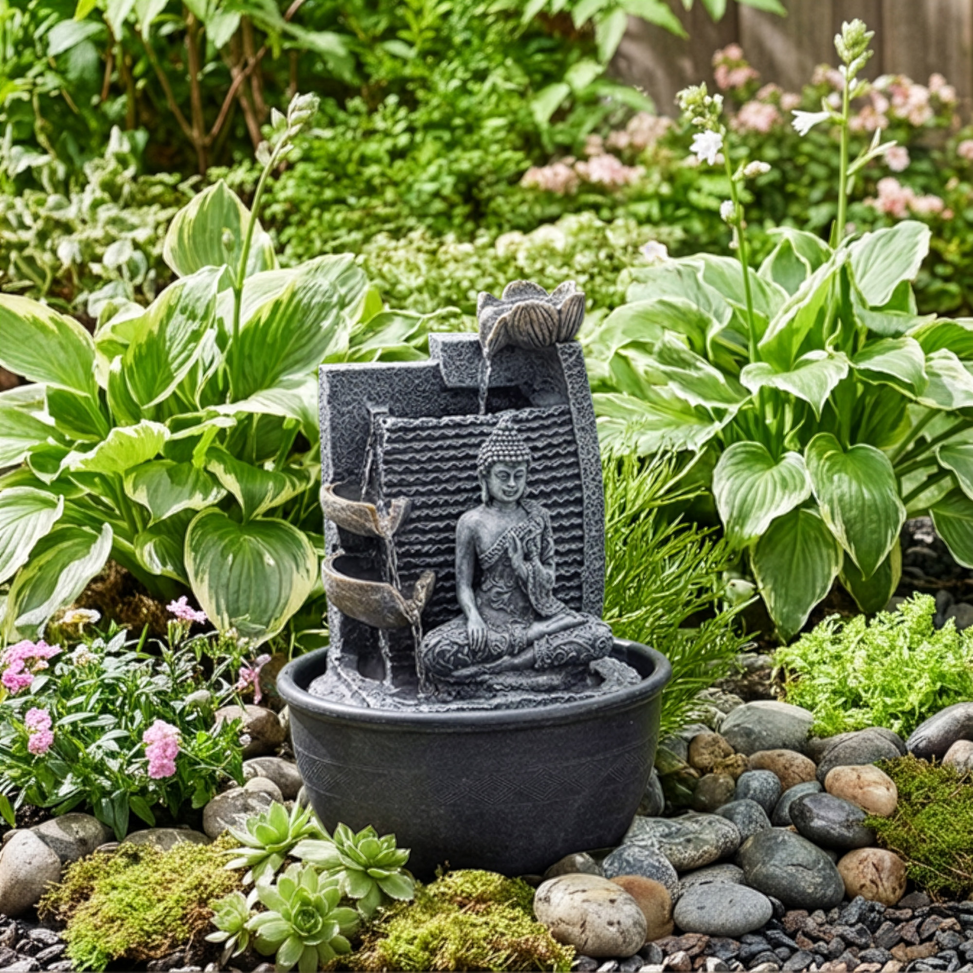 Le Bouddha sculpté, aux traits calmes et expressifs, apporte une présence paisible, tandis que le lotus, symbole de clarté et de renouveau, renforce la dimension spirituelle de l’ensemble. Le décor effet pierre, décliné dans des teintes gris minéral, donne à la fontaine un aspect naturel et intemporel, facile à intégrer dans différents styles d’intérieur.