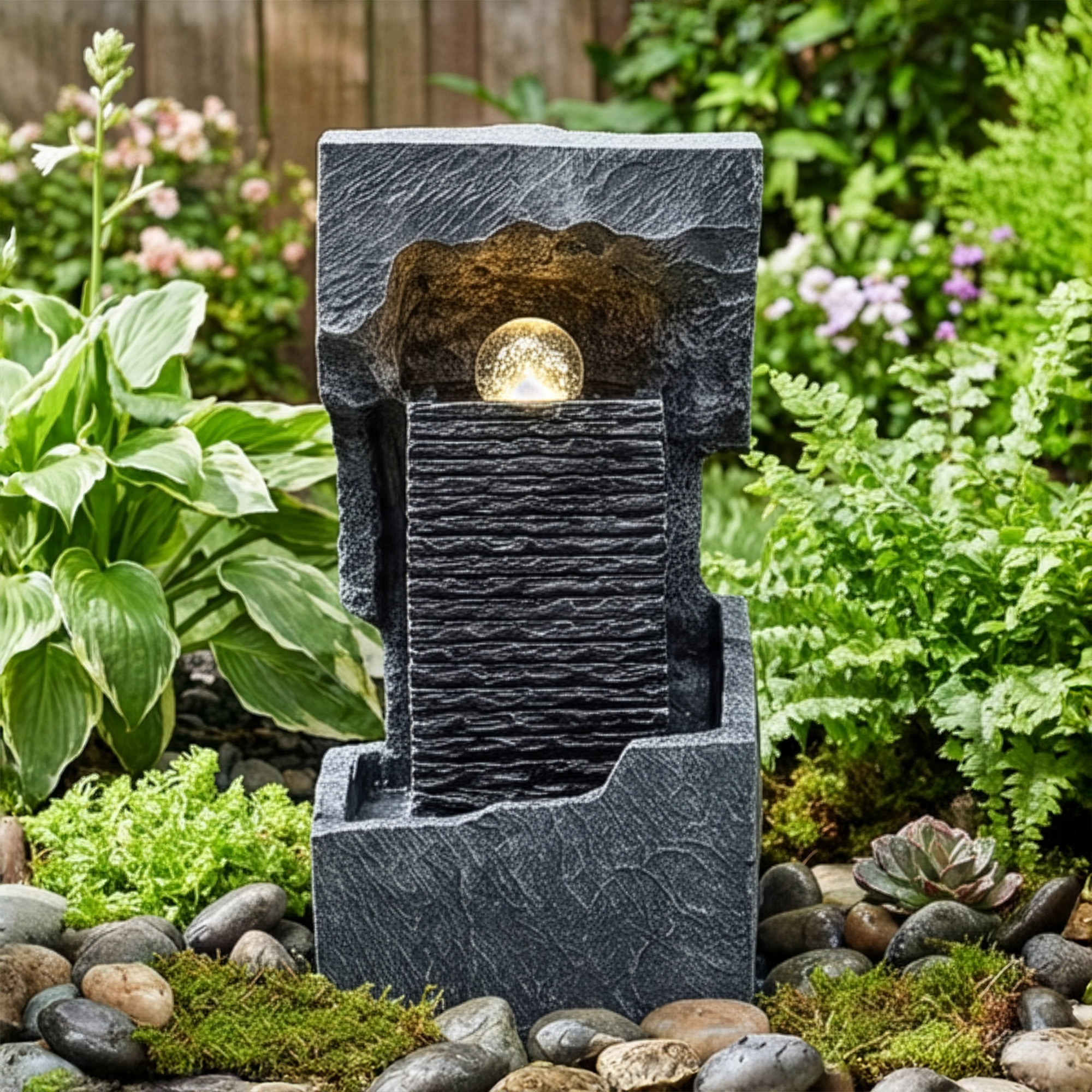 Le cœur de la structure accueille une colonne texturée effet roche, le long de laquelle l’eau s’écoule de manière fluide et silencieuse, avant de rejoindre le bassin inférieur. Intégrée dans la partie haute, la boule en cristal à éclairage LED multicolore diffuse une lumière douce et évolutive, créant des reflets subtils sur les surfaces minérales et renforçant la sensation de profondeur.