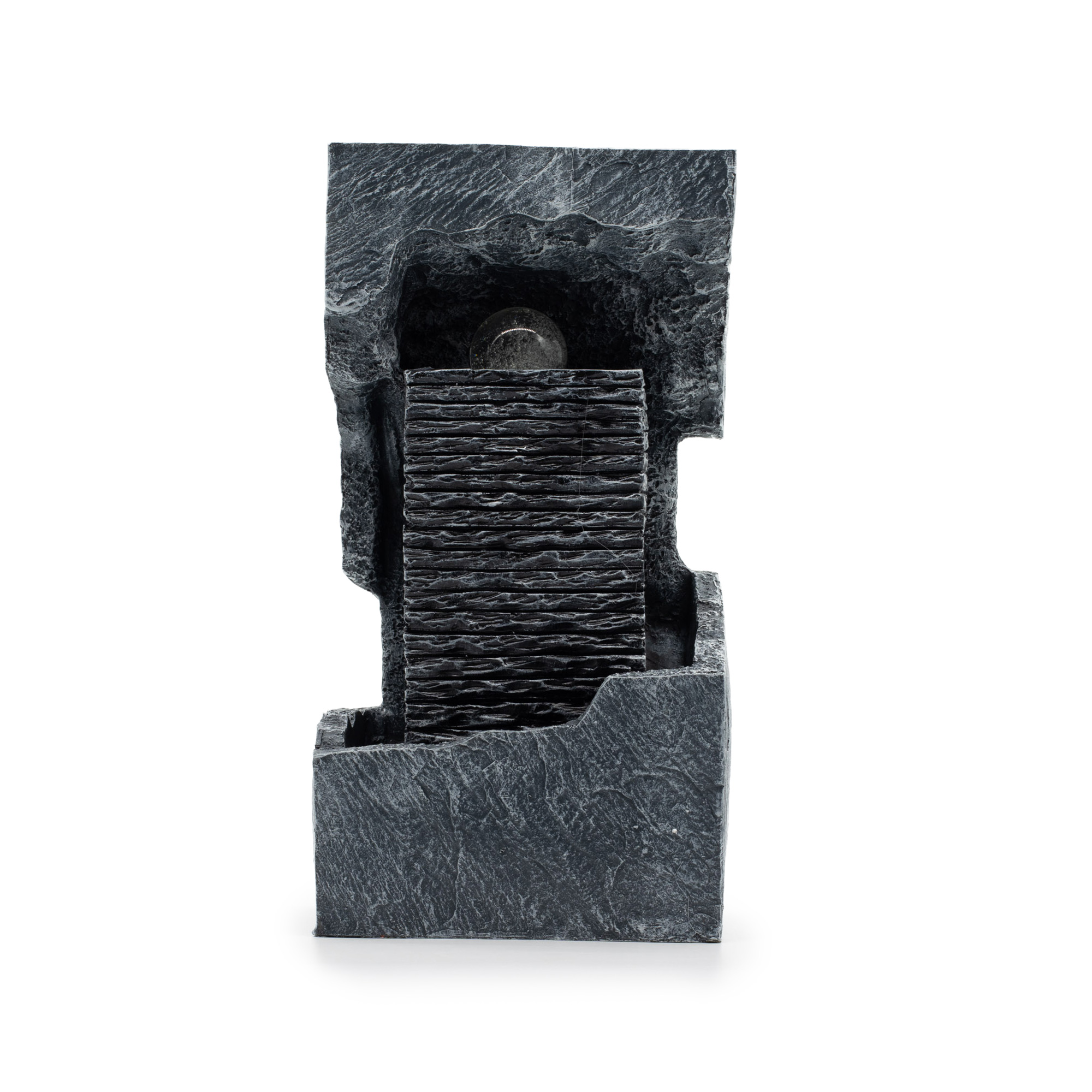 Cette fontaine d’intérieur grand format se distingue par une approche graphique et architecturale, évoquant un monolithe minéral ouvert laissant apparaître l’eau et la lumière en son centre. Sa conception verticale et épurée en fait une pièce décorative forte, pensée comme un véritable objet d’art contemporain.