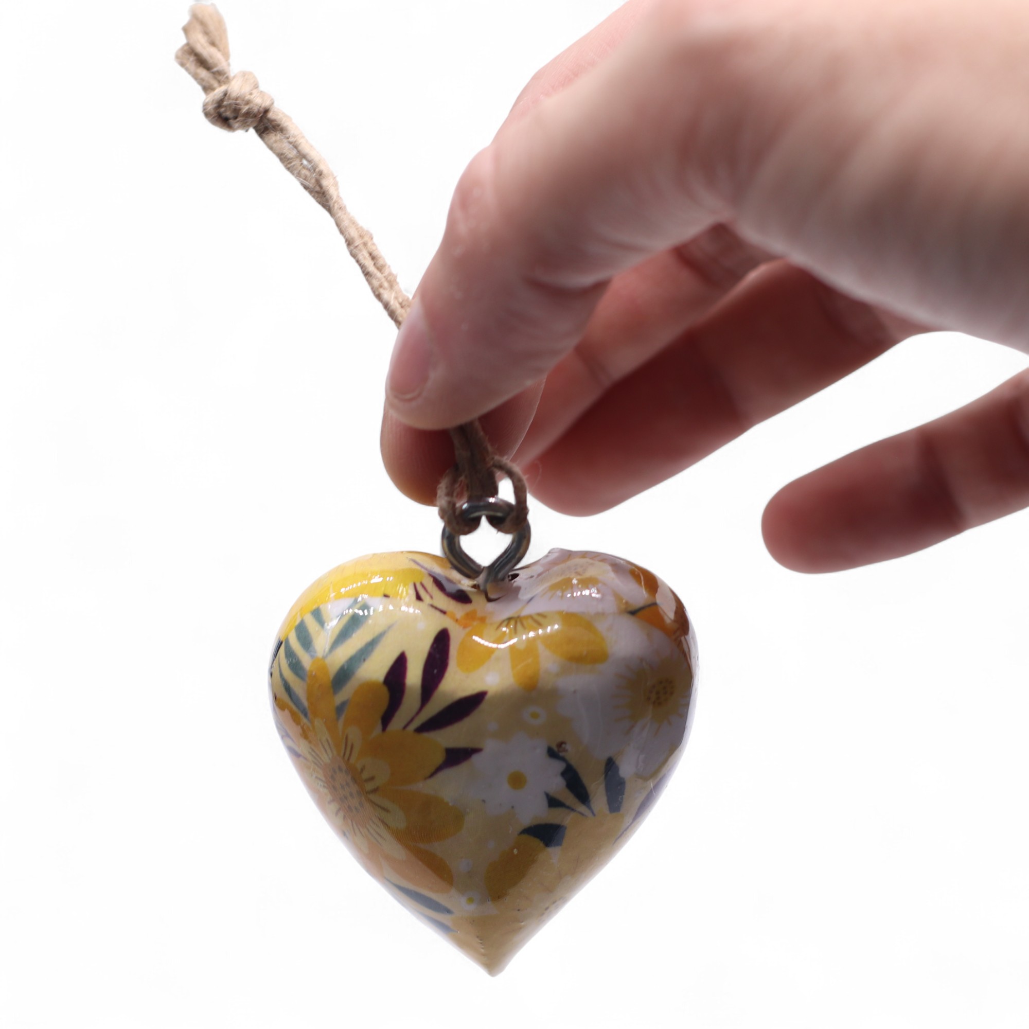 Chaque cœur est fabriqué artisanalement en Inde, dans le respect de l’artisanat éthique, mêlant bois naturel et émaillage coloré. Leur ton jaune éclatant en fait un choix parfait pour une décoration de Noël, de printemps ou de boutique.