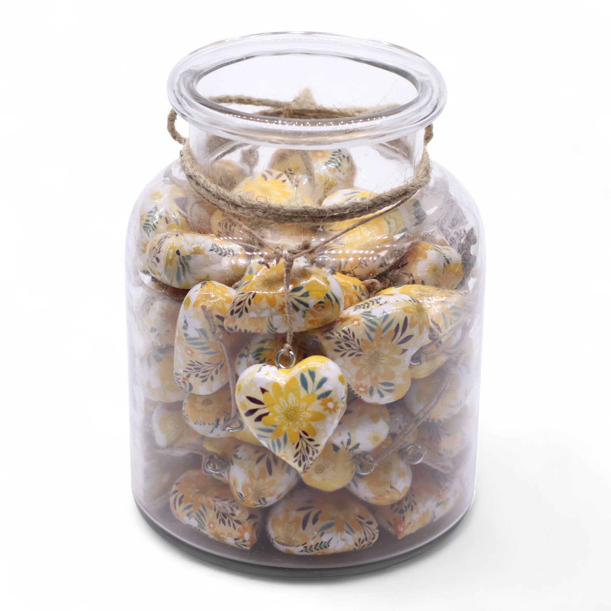 Apportez chaleur et luminosité à vos présentations avec ces grands cœurs en bois décoratifs peints à la main de motifs floraux jaunes. Présentés dans un bocal en verre orné d’une corde naturelle, ils incarnent le charme artisanal et la gaieté d’une déco ensoleillée.