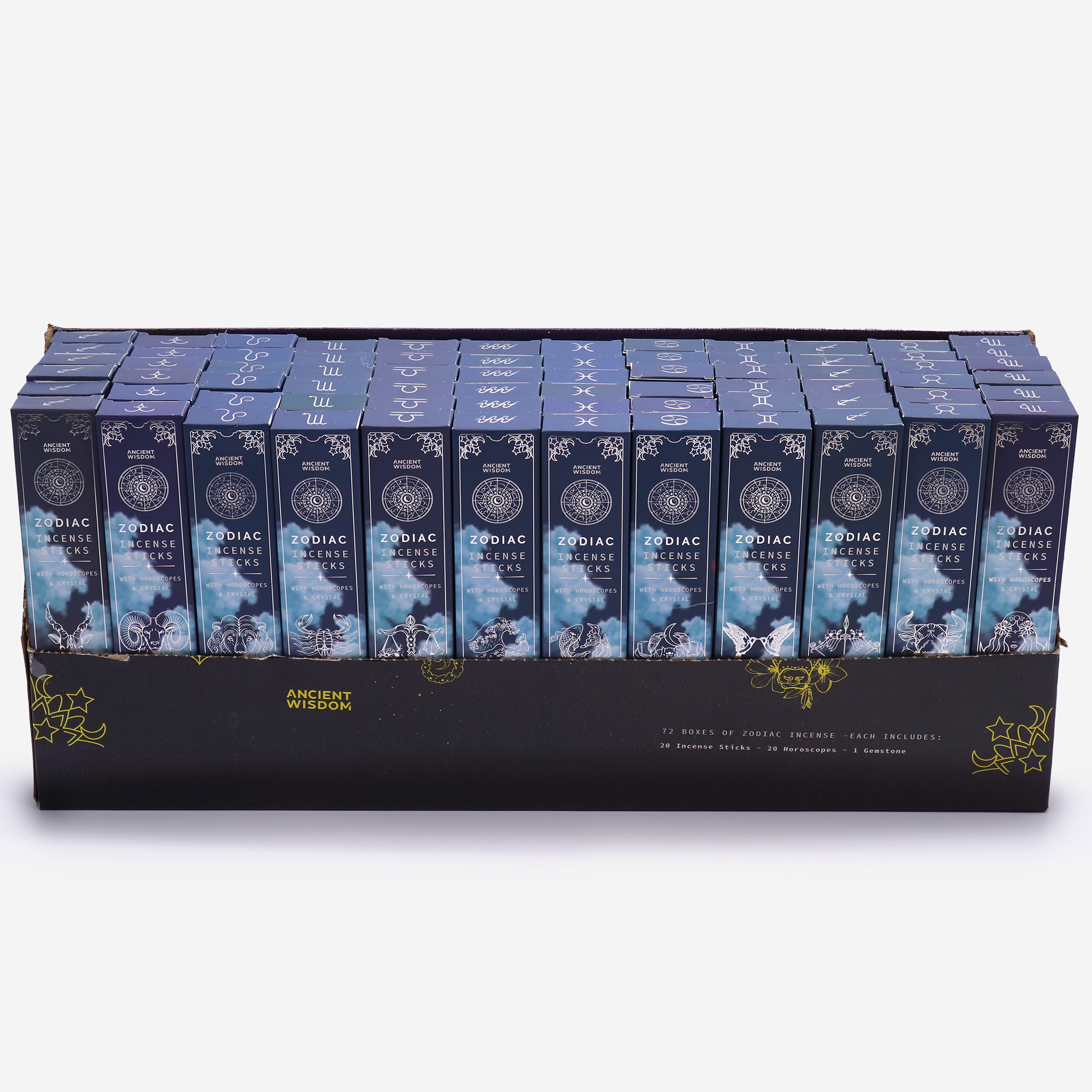 Offrez à votre boutique la gamme complète Du Pack Encens Cristal du Zodiaque en un seul pack prêt à exposer. Ce coffret comprend les 12 signes du zodiaque, avec 6 boites par signe et une boîte de présentation incluse, idéale pour la vente en magasin.